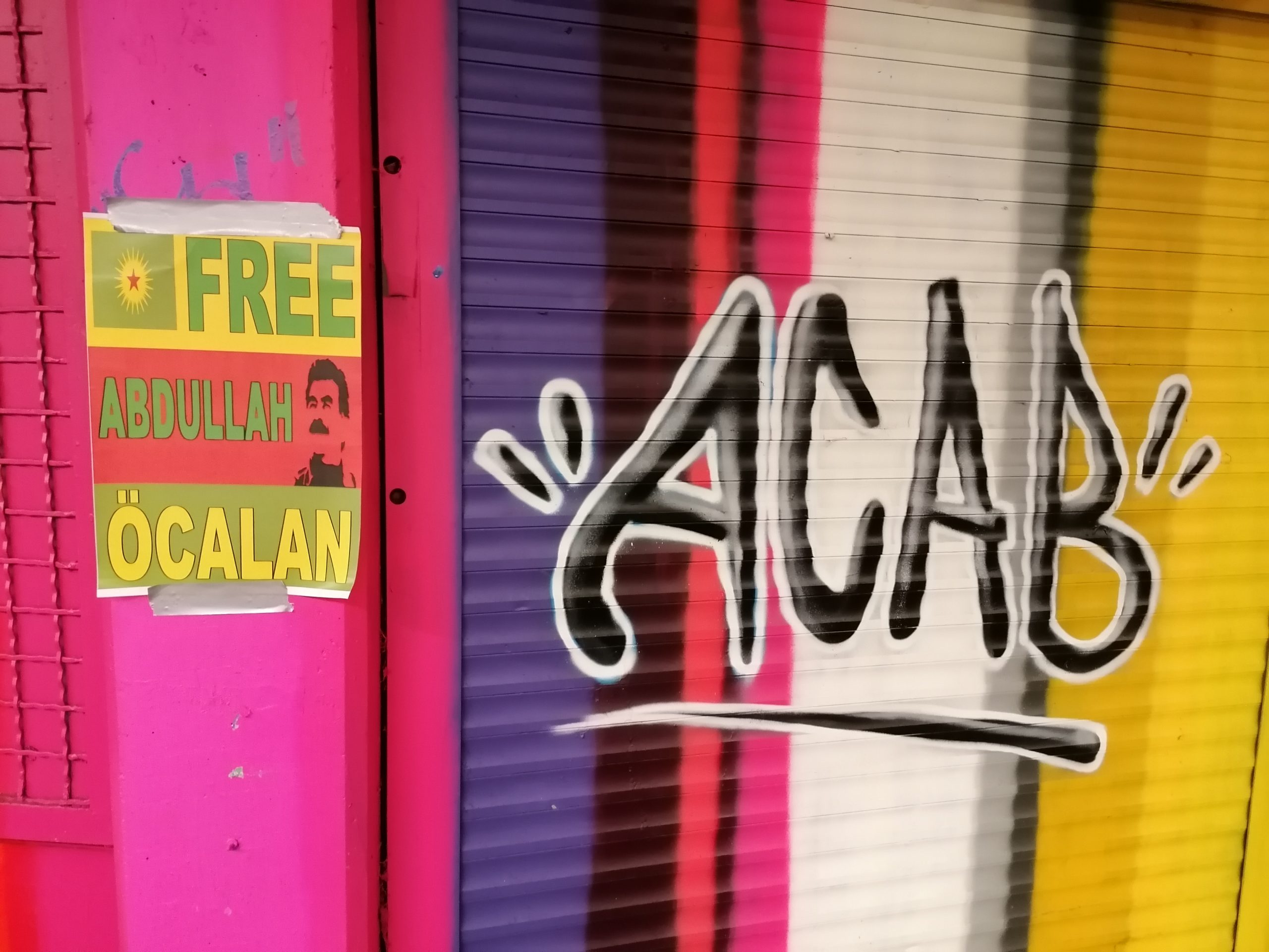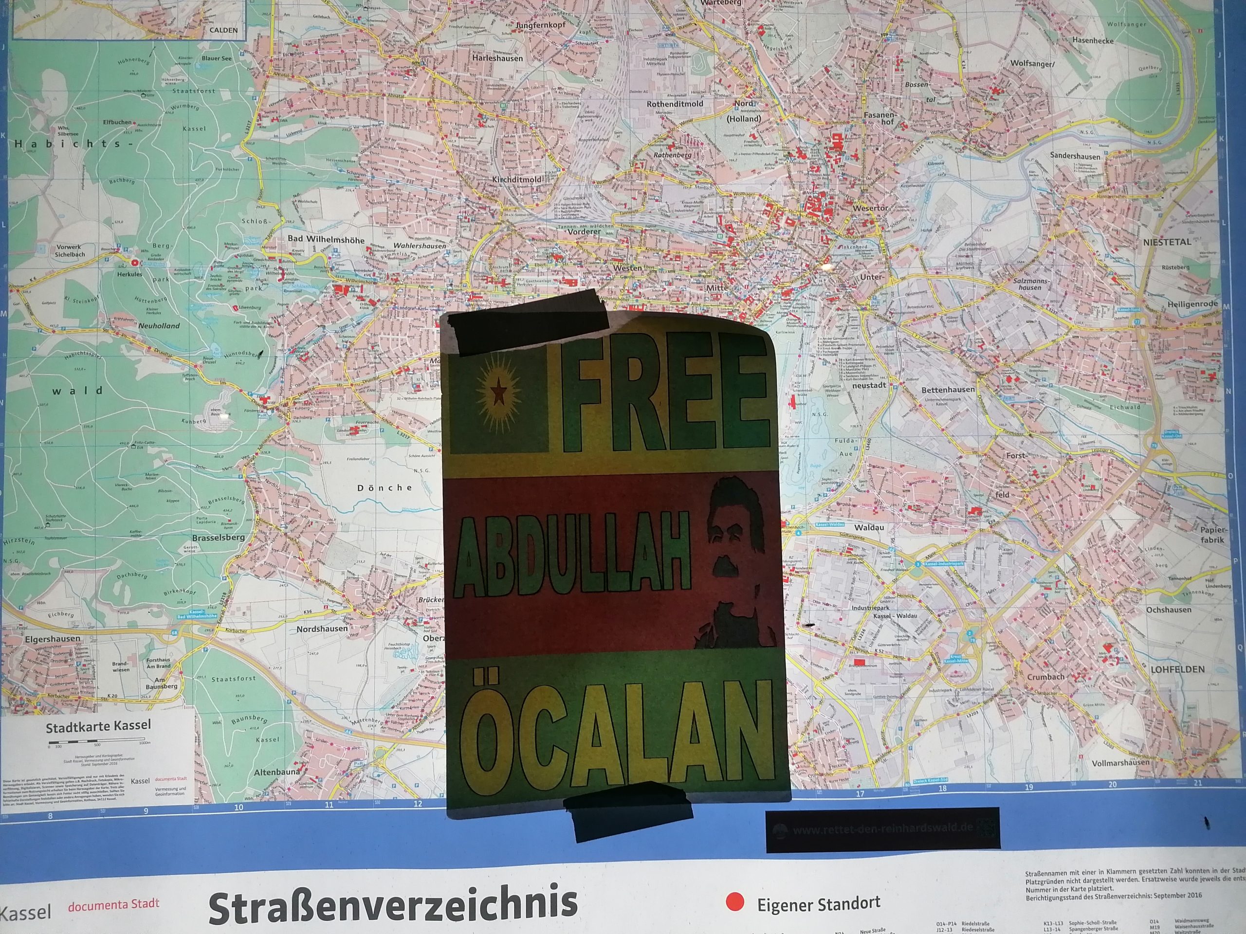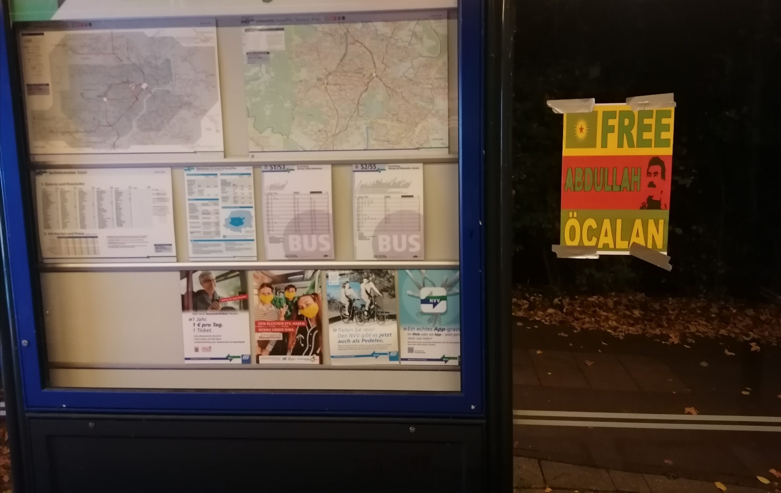 Kassel’de de gençler, otobüs durakları ve şehrin farklı noktalarına üzerinde, “Free Abdullah Öcalan” (Abdullah Öcalan’a Özgürlük) yazan afişler yapıştırdı.