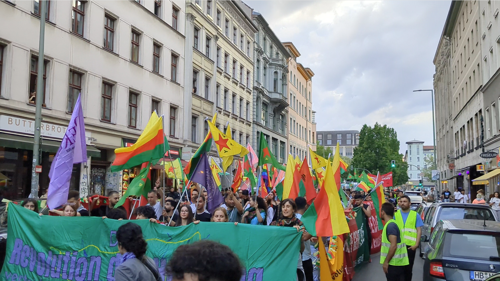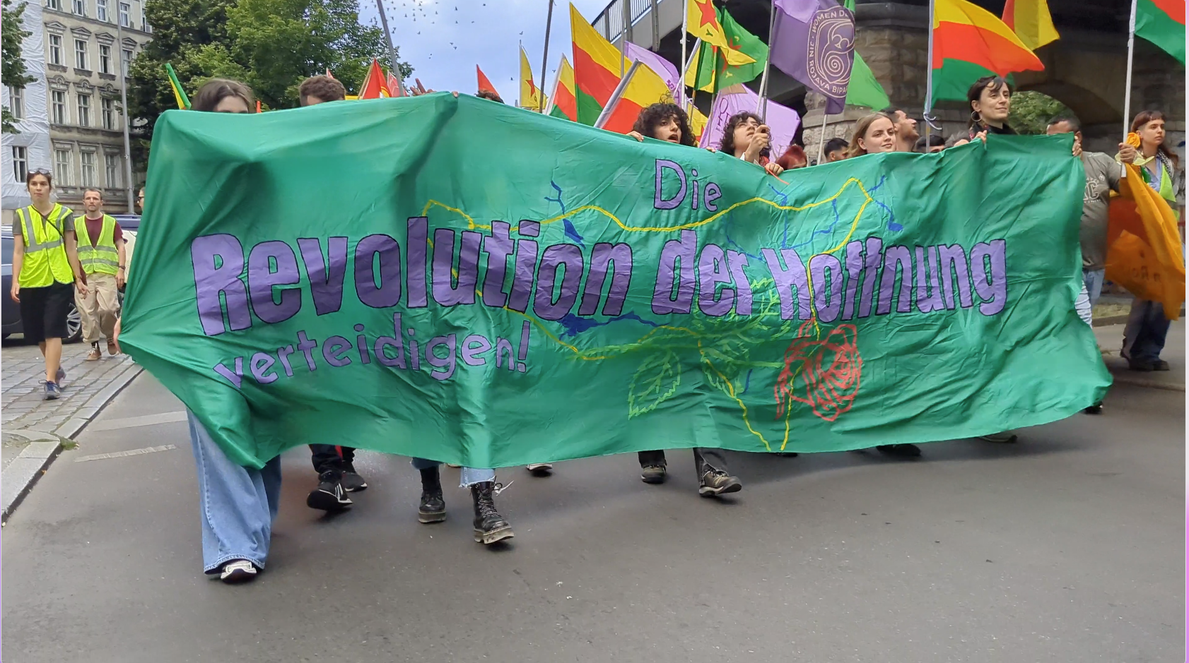 BERLİN- TCŞ (Tevgera Ciwanên Şoreşger) ve Enternasyonalist gençlik komünü öncülüğünde Rojava Devriminin 11. yılı ‘Rojava Şoreşa Hêvîyê (Rojava Umut Devrimidir)’ şiarıyla bir yürüyüş gerçekleştirildi.