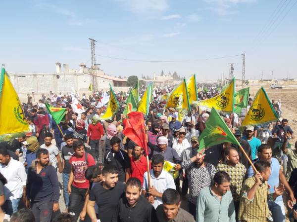 Gel ber bi Til Xelefê ve meşiyan. Di meşê de dirûşmeyên “Terorîst Erdogan”, “Na ji dagirkeriya tirk re” û “Bijî Yekîtiya Gelan” hatin avêtin.