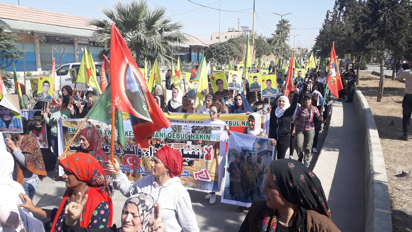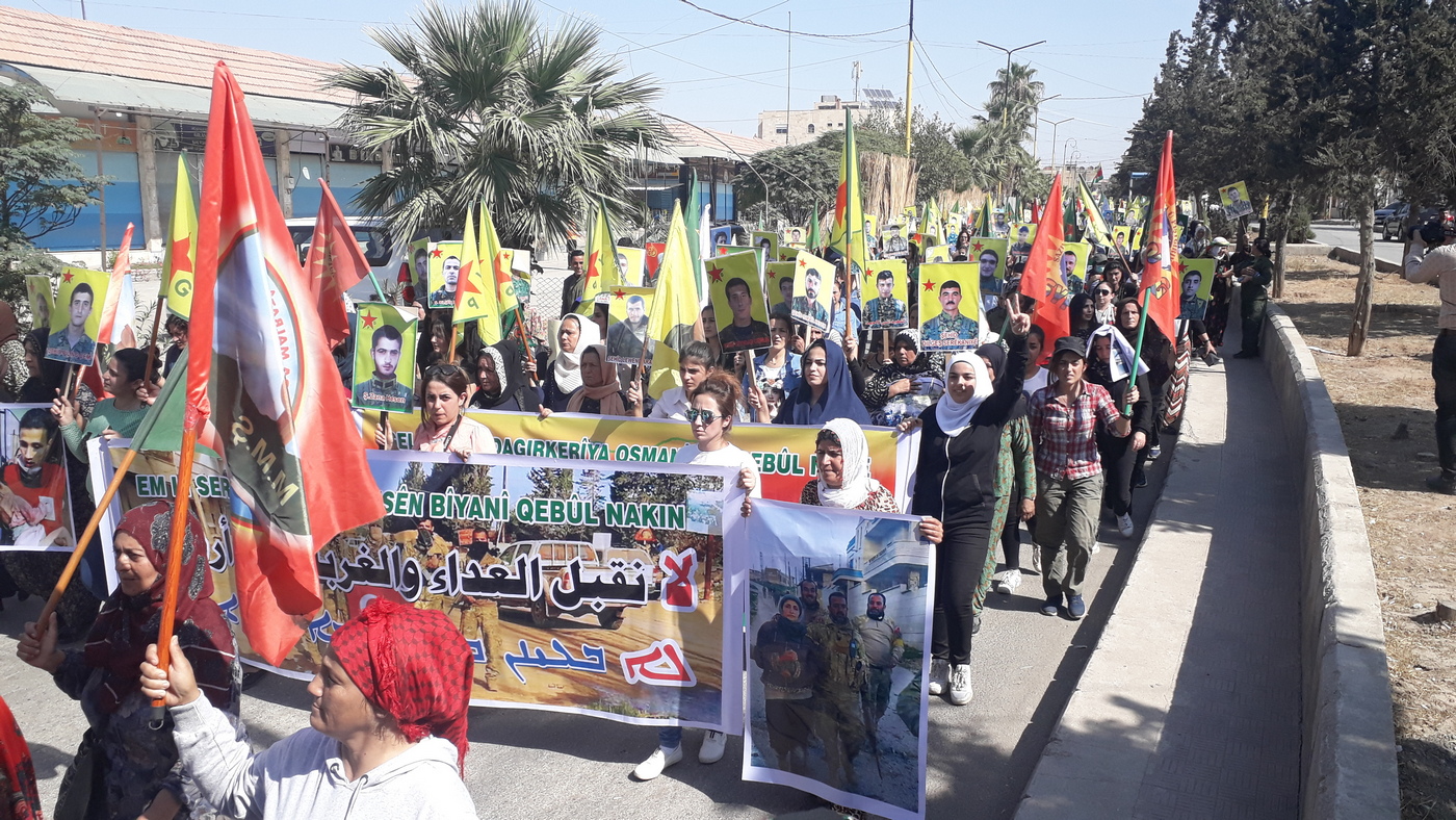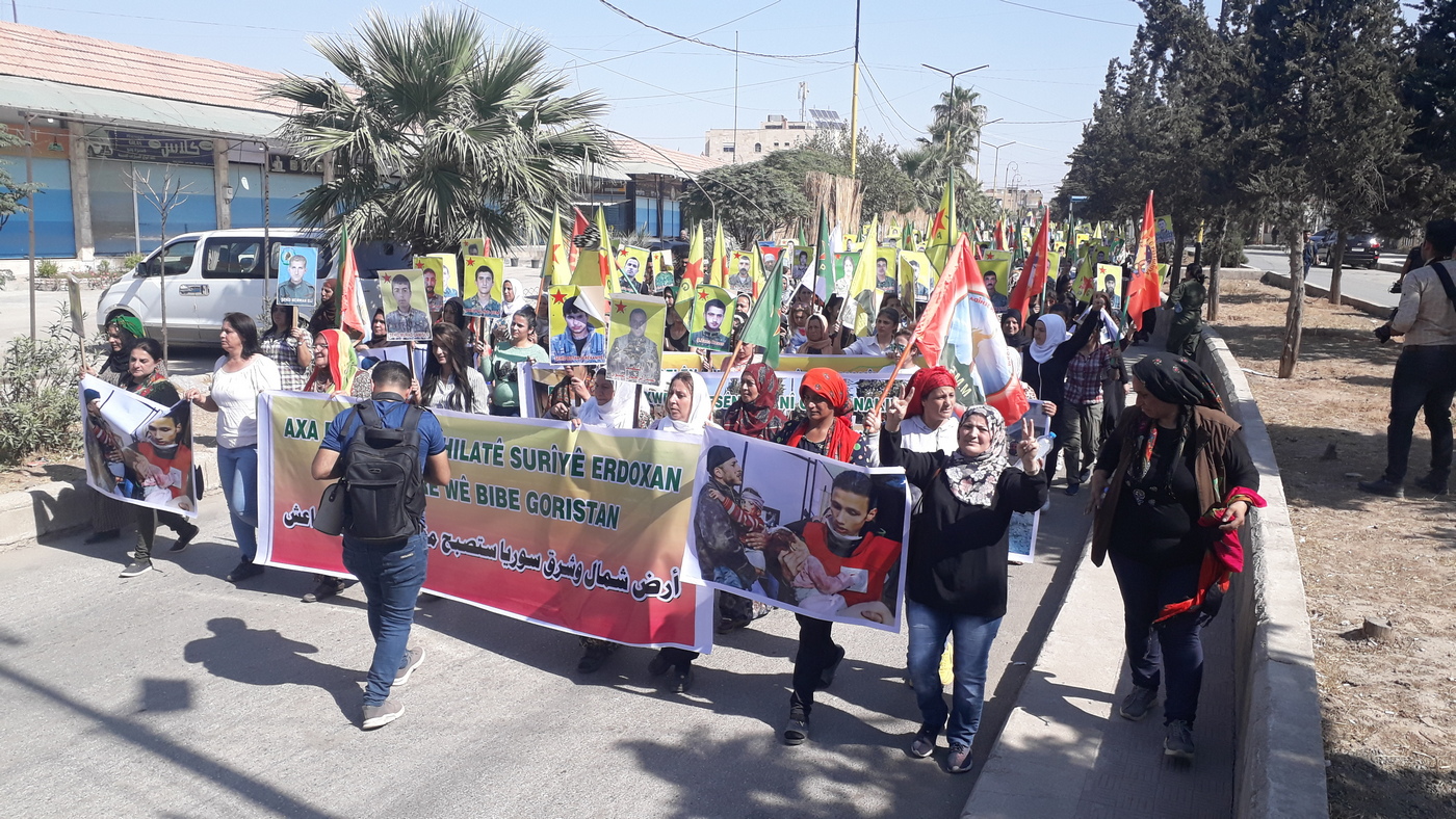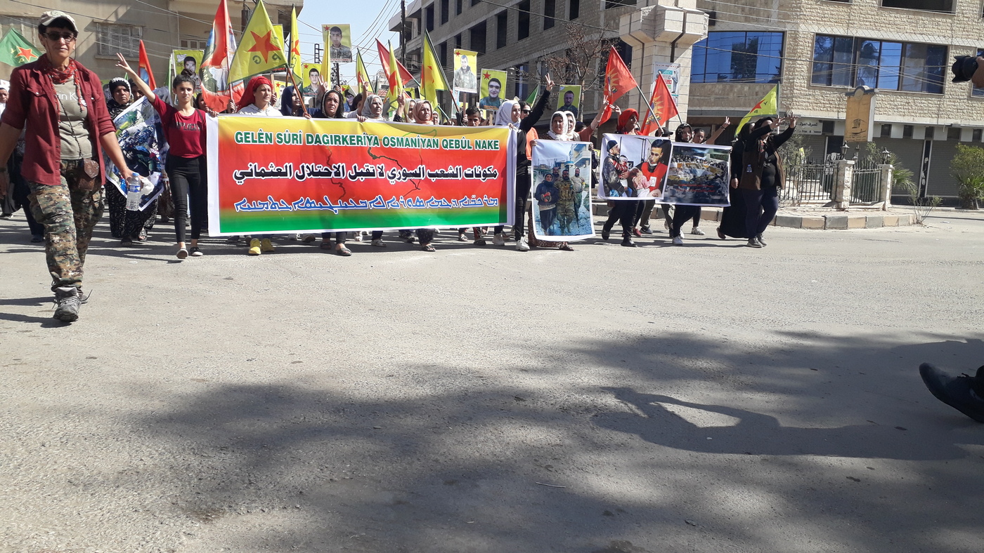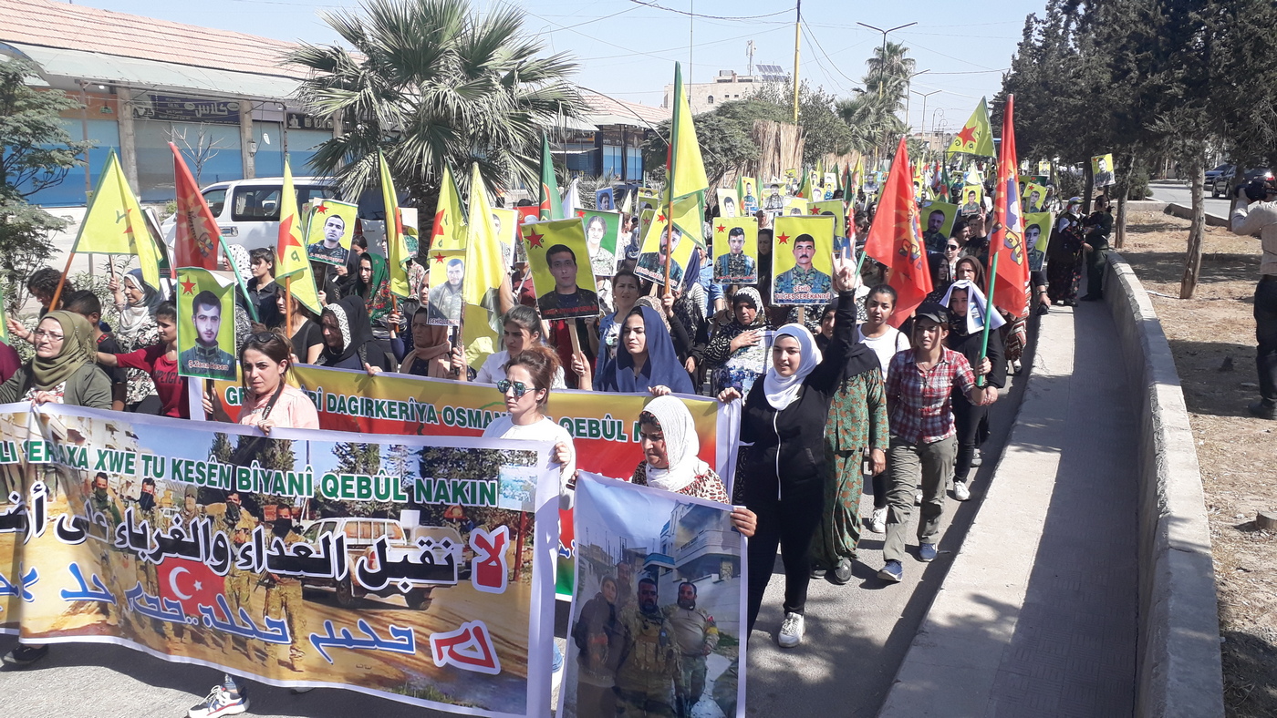 QAMIŞLO – Bi hezaran gelê Qamişlo li dijî êrîşên dewleta tirk a dagirker daketin qadan û peyama parastina axa xwe dan. Di saetên sibê de gel li dagirkeriya dewleta tirk gelê Qamişlo ji 7 heta 70 salî li dewra Şerqî kombûn. Bi dirûşmeyên berxwedanê gelê Qamişlo li tevahî bajar meşiyan. Di çalakiyê de sloganên wek “Bijî Berxwedan Rojava/Qamişlo”, “BiJî Serok APO”, “Bimre dagirkerî” hatin berz kirin.