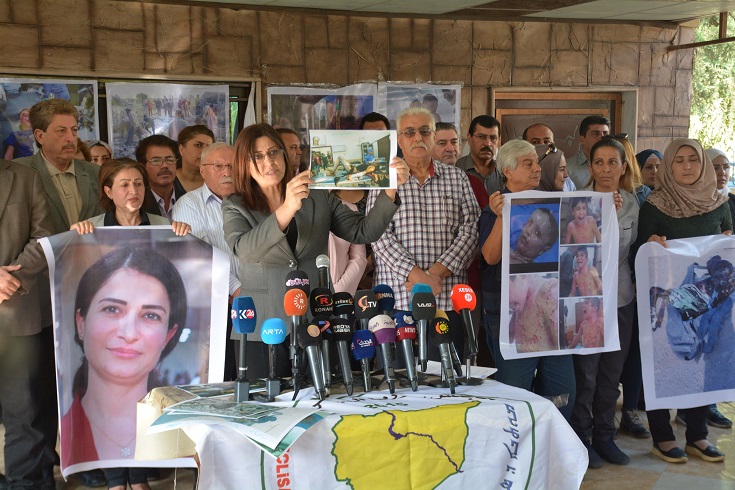 Nûnerên partiyên siyasî yên di bin banê MSD’ê de tevlî civîna çapemeniya bûn û wêneyên şehîd Hevrîn Xelef a Sekretera Giştî ya Partiya Sûriyê ya Pêşerojê, wêneyên qurbaniyên bombebarana balafirên artêşa dewleta Tirk a dagirker û birîndarên bi çekên qedexekirî, hildan.