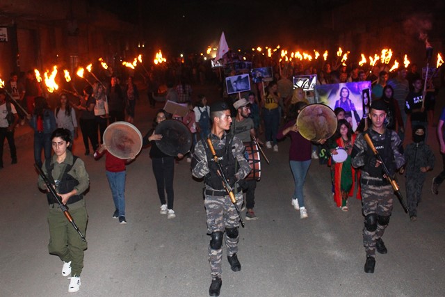 Di meşa ku ji pêşiya navenda ciwanan a rojavayê navçeyê destpê kir de, bi sedan kes tevlî bibûn. Di meşê de meşele, alên QSD, wêneyên qurbaniyên sûcên artêşa dagirker hatin hildan.
