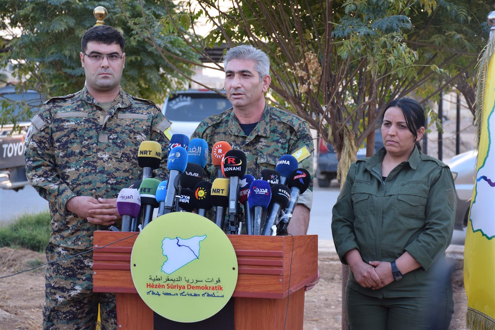 Daxuyanî bi zimanê Kurdî ji aliyê Berpirsê Têkiliyên Giştî yê QSD‘ê Rêdûr Xelîl û bi zimanê Erebî ji aliyê Berdevkê Fermî yê QSD‘ê Kîno Gabriyêl ve hate xwendin.