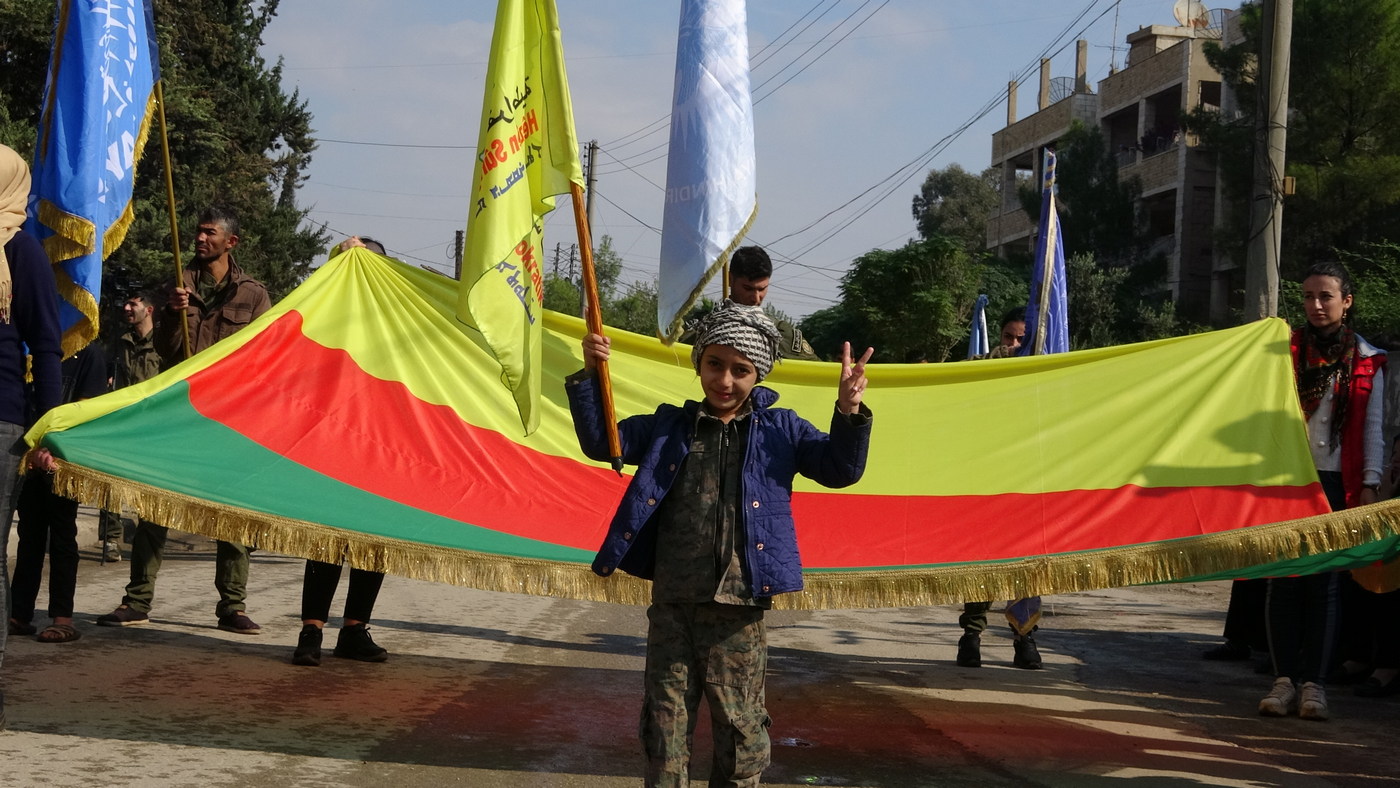 Her wiha pankartên bi nivîsa “QSD’ê nûnertiya me dike”, “2’ê Mijdarê Roja Rojava ya Cîhanî”, “Her der Rojava ya û li her derê berxwedan e” û “Em hemû QSD’ê ne” hatin hildan.