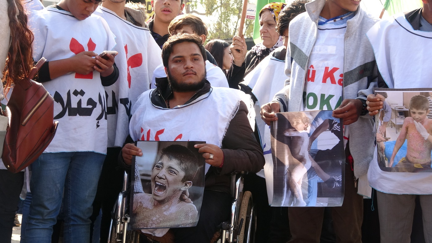 Her wiha koçberên Serêkaniyê ku ji ber êrîşên dewleta Tirk a dagirker û çeteyên wê neçarî koçberiyê bûne tev li meşê bûn.