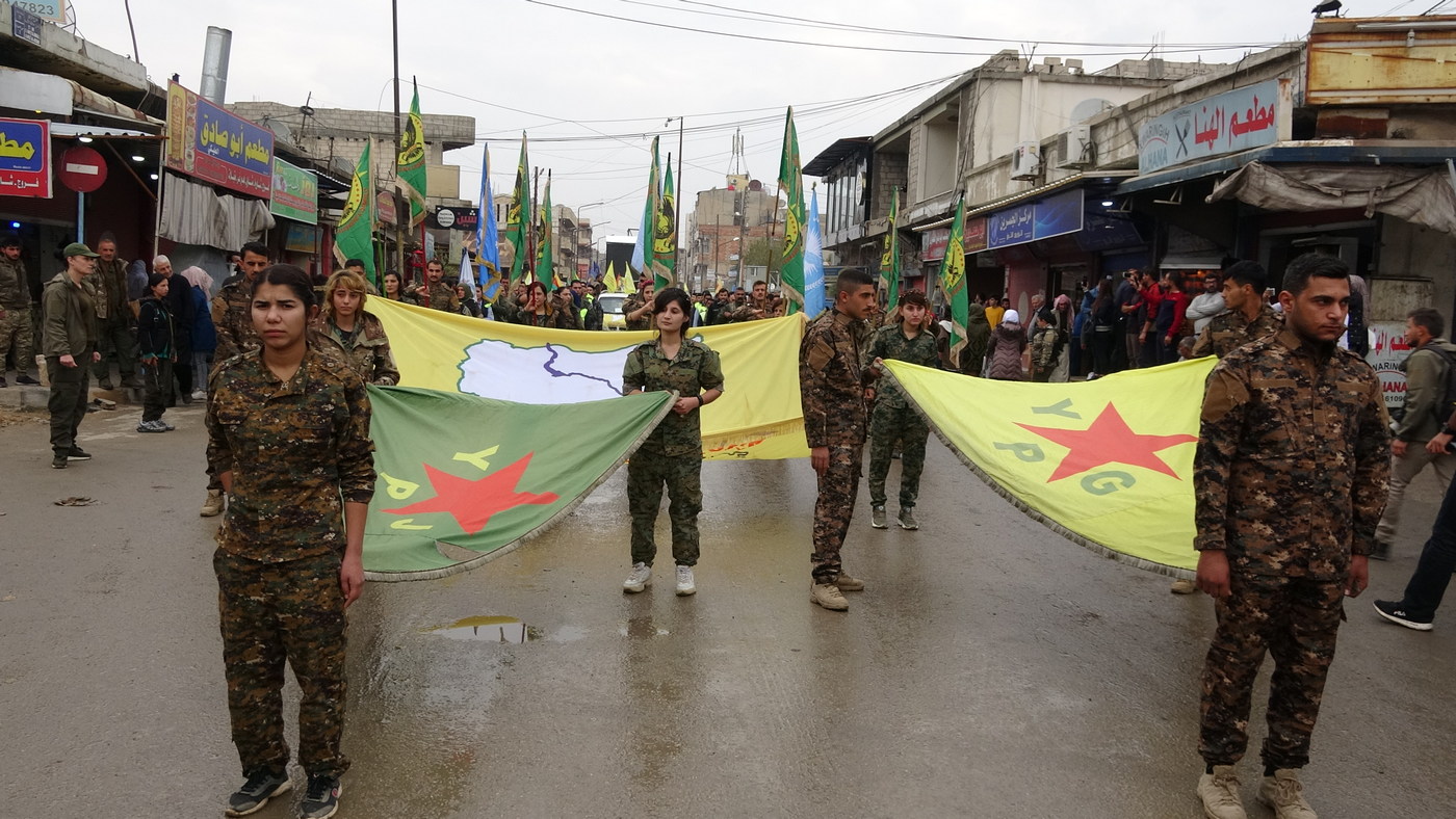 Meş ji navenda bajêr dest pê kir. Di meşê de dirûşmeyên silavkirina berxwedana Rojava û berxwedana şervanên QSD’ê hatin berzkirin. Meş li ber navenda NY ya Qamişlo veguherî mîtîngê.