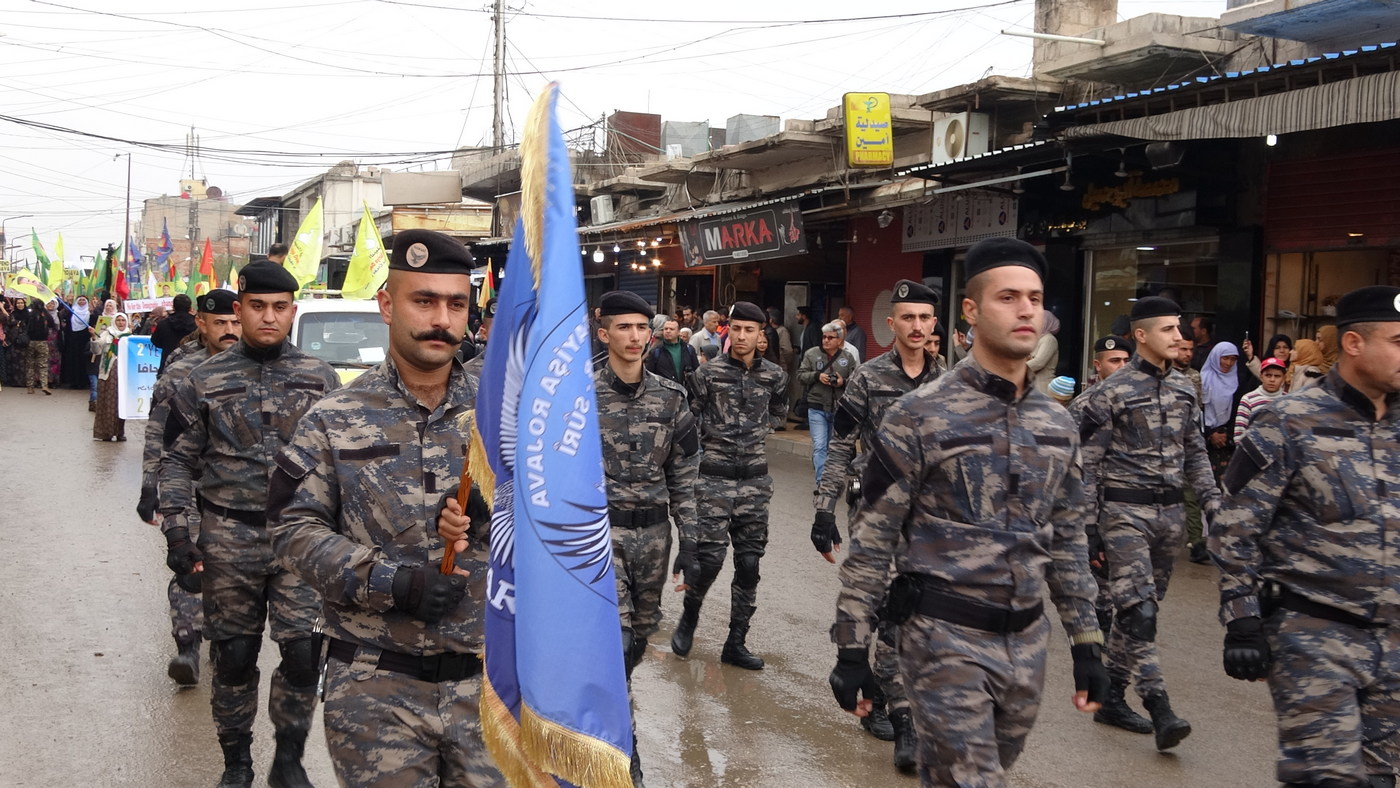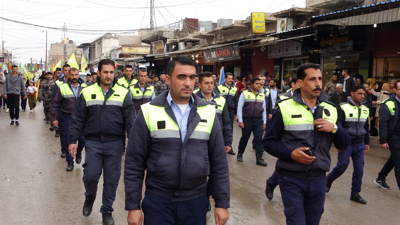 Pêkhateyên Qamişlo, Kurd, Ereb, Suryan, şandeyek ji Rêveberiya Xweser a Demokratîk a Herêma Cizîrê, nûnerên partiyên siyasî, rewşenbîr, oldar, hunermend, rûspiyên eşîran, şervanên Meclisa Leşkerî ya Qamişlo, endamên hêzên Ewlekariya Hundrîn (Hêzên Hewarî û Tirafîk) tev li meşê bûn.