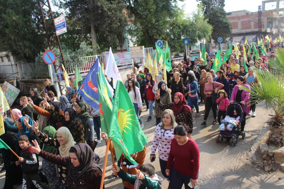 Di meşê de, şêniyan pankartên bi nivîsên “2’ê Mijdara 2019’an Roja Cîhanê ya Rojava, her der Rojava ye , her der jî berxwedan e” û her wiha alên QSD’ê, YPJ, YPG’ê û Kongre Star jî, hildan.