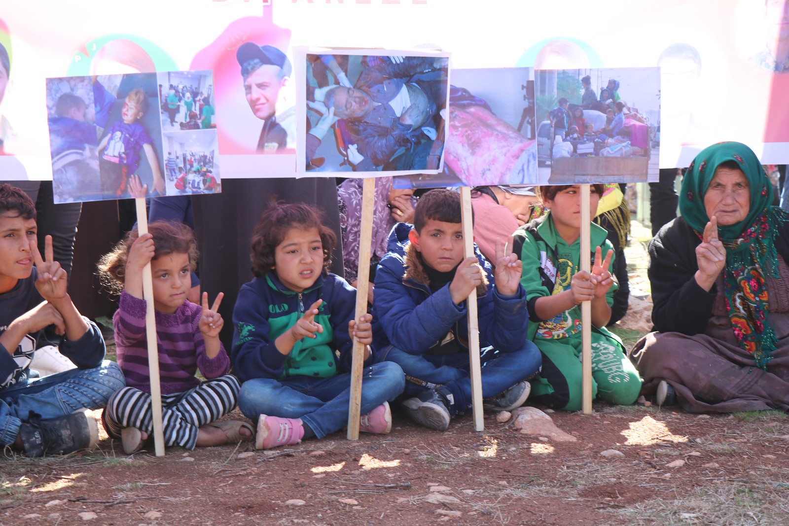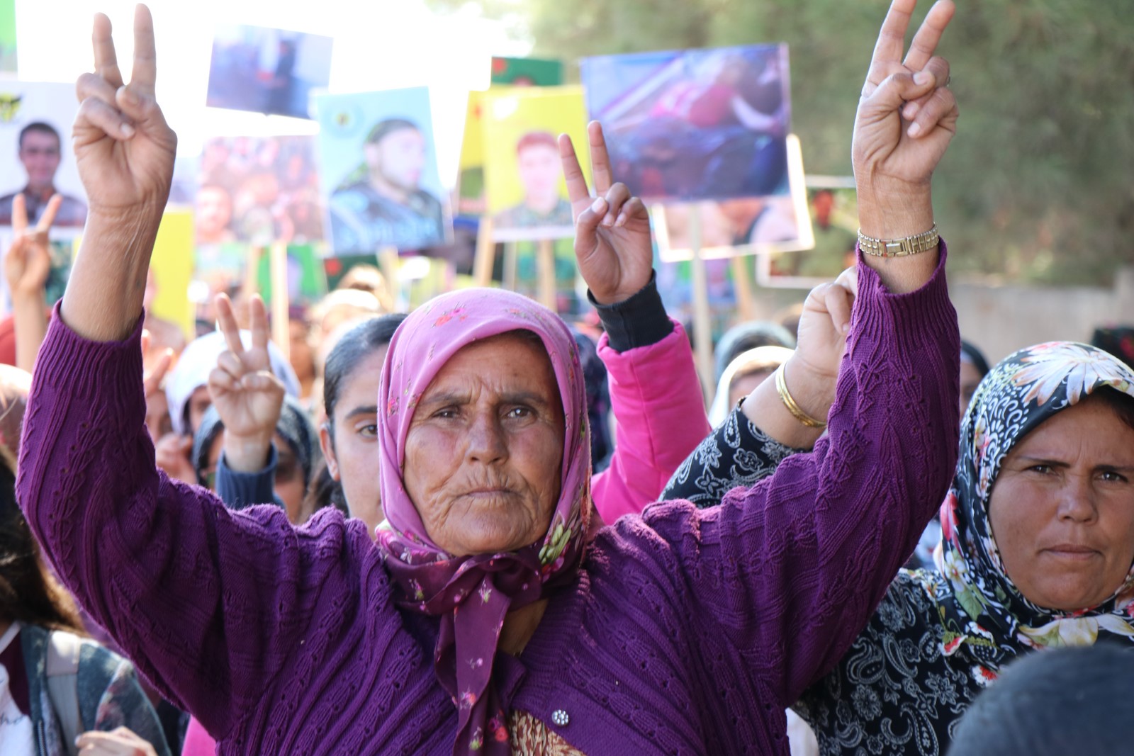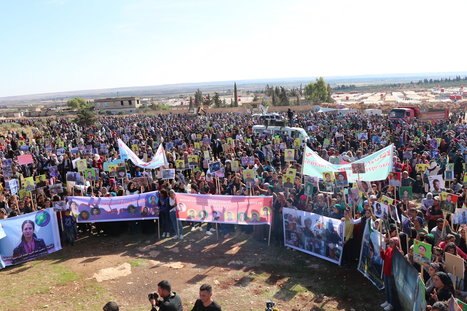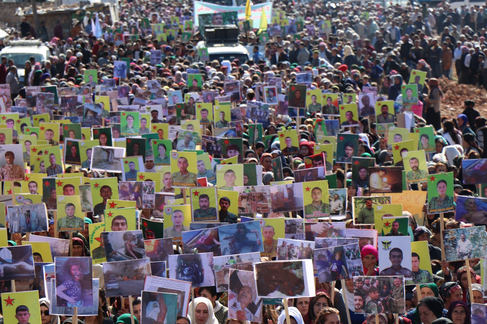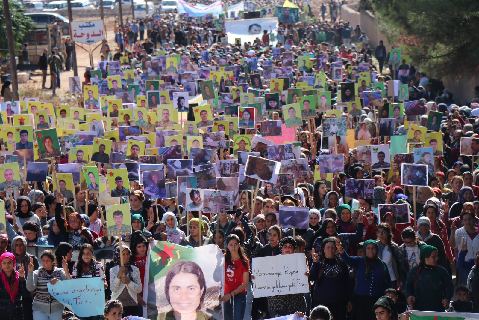 EFRÎN – Bi hezaran şêniyên herêma Efrînê li pêşiya nexweşxaneya Avrîn a li navçeya Fafîn a kantona Şehbayê kom bûn, alên YPG, YPJ û QSD û wêneyên şehîdan û birîndarên şer û qûrbaniyên êrişa dewleta dagirker a tirk û hildan.