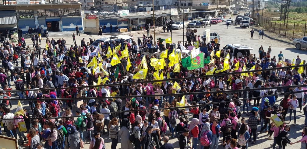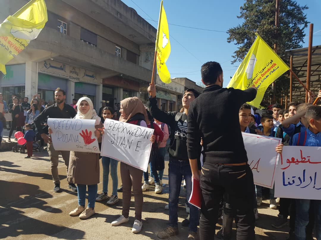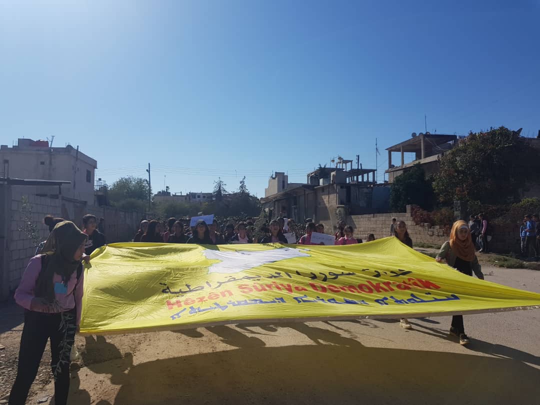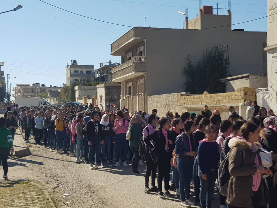 Xwendekar û mamosteyan pankartên bi nivîsên”Me qetil nekin, QSD`ê nûnertiya me dike, şerê ku dibistan û pêşeroja me wêran dike, rawestînin û li vir berxwedêr in”, wêneyên şehîdên Berxwedana Rûmetê û wêneyên zarokên qurbaniyên çekên kîmyawî, hilgirtin.