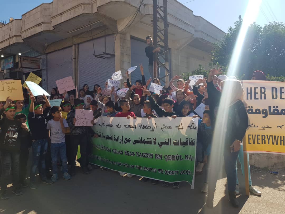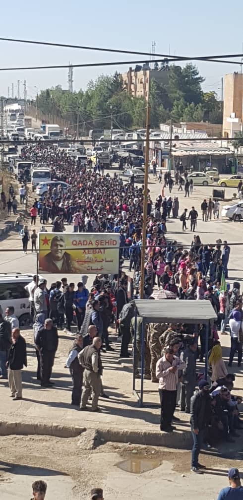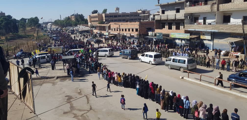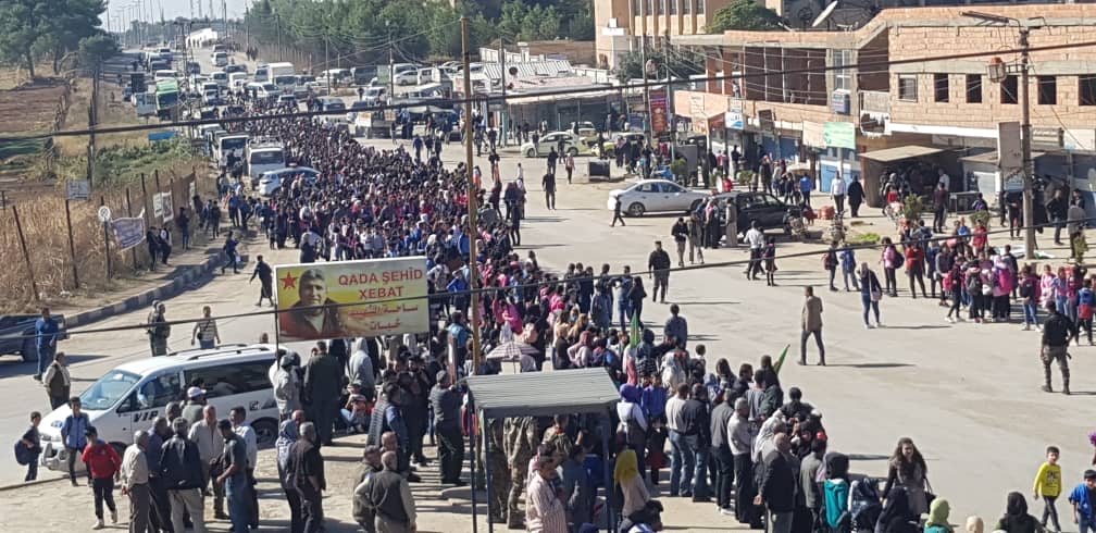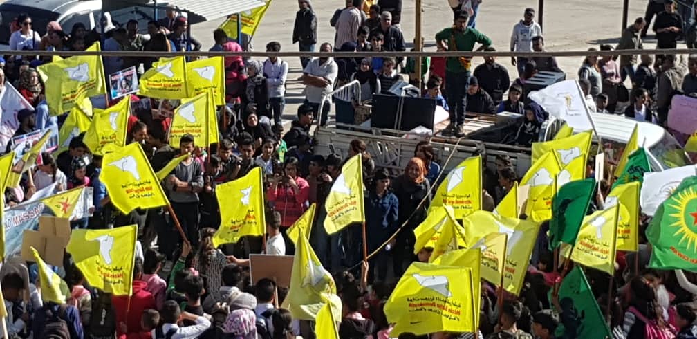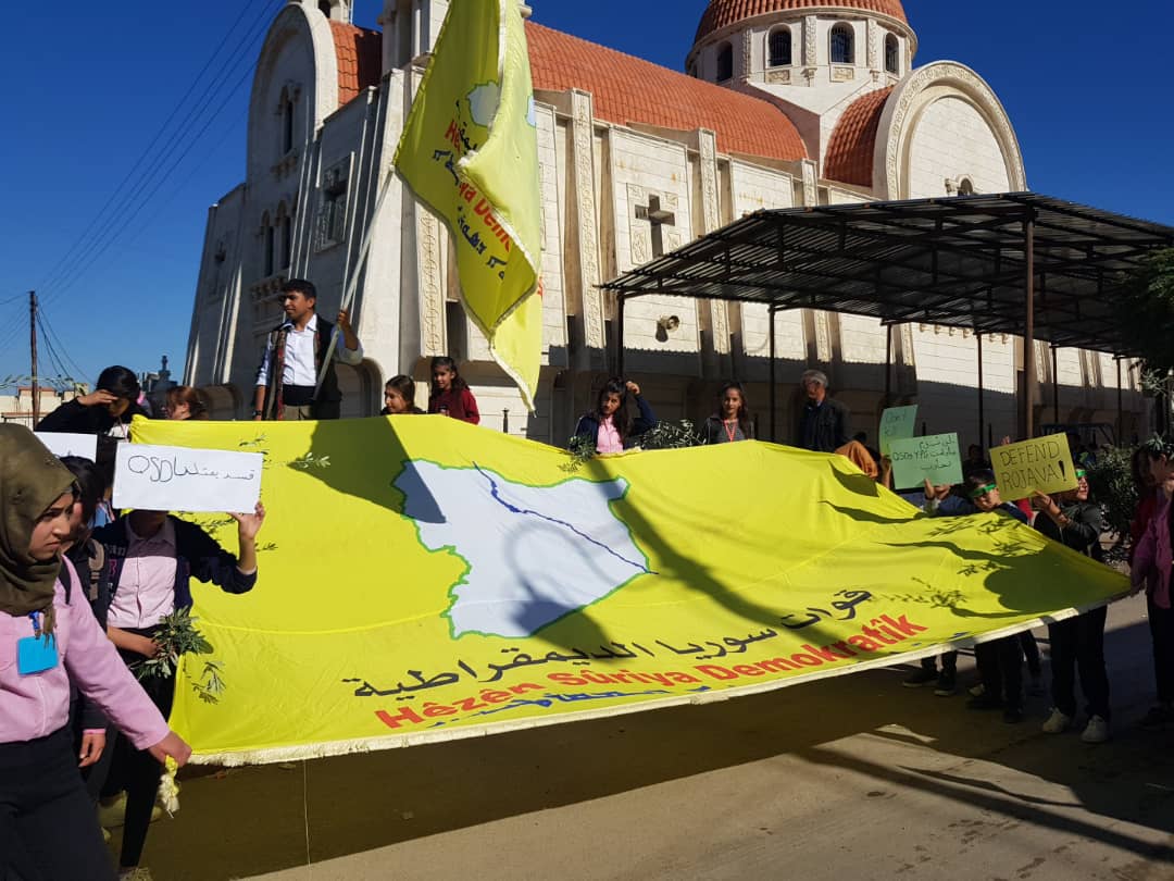 Xwendekar û mamosteyan pankartên bi nivîsên”Me qetil nekin, QSD`ê nûnertiya me dike, şerê ku dibistan û pêşeroja me wêran dike, rawestînin û li vir berxwedêr in”, wêneyên şehîdên Berxwedana Rûmetê û wêneyên zarokên qurbaniyên çekên kîmyawî, hilgirtin.