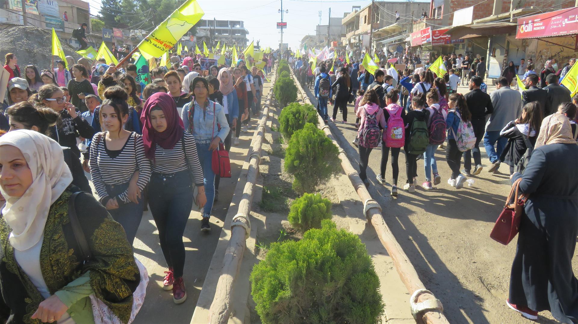 Meş ji Qada Şehîd Xebat a Dêrikê dest pê kir û ber bi kolanên sereke ve çû, paşê li naverasta bajêr veguherî mîtîngê.