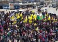 Piştî daxuyanî bi dawî bû, xwepêşandêran diruşmên “Bijî berxwedana QSD’ê” berz kirin.