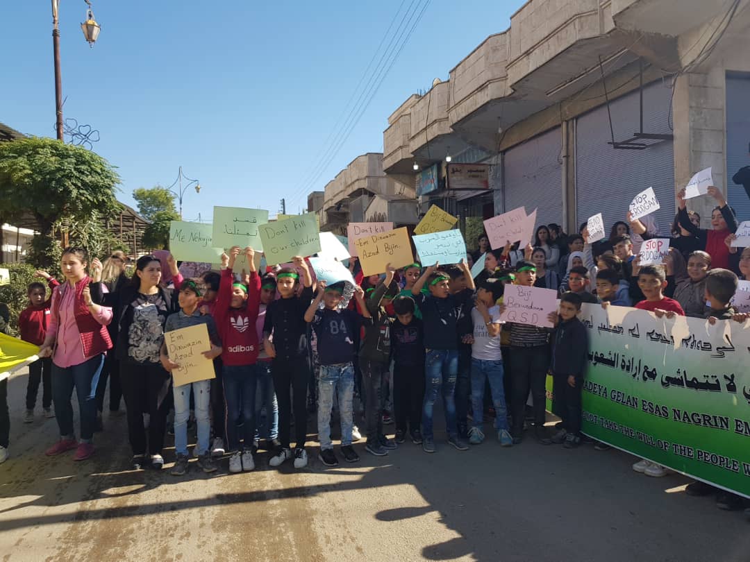 Xwepêşandêran alên QSD’ê, wêneyên qurbaniyên êrişên artêşa Tirk ên li ser herêma Serêkaniyê hilgirtin û dirûşmên”fêrkirina me gavên destpêkê yên avakirina pêşeroja me ye, şerê dibistan û pêşeroja me wêran dike, rawestînin, parastina zarokan ji dijminan bikin” berz kirin.