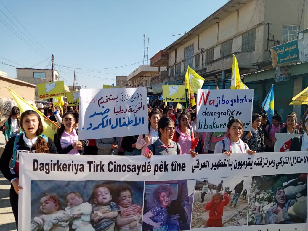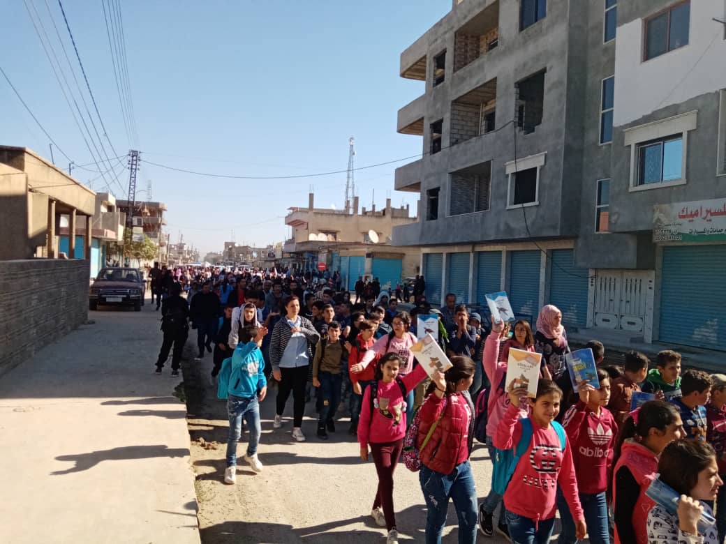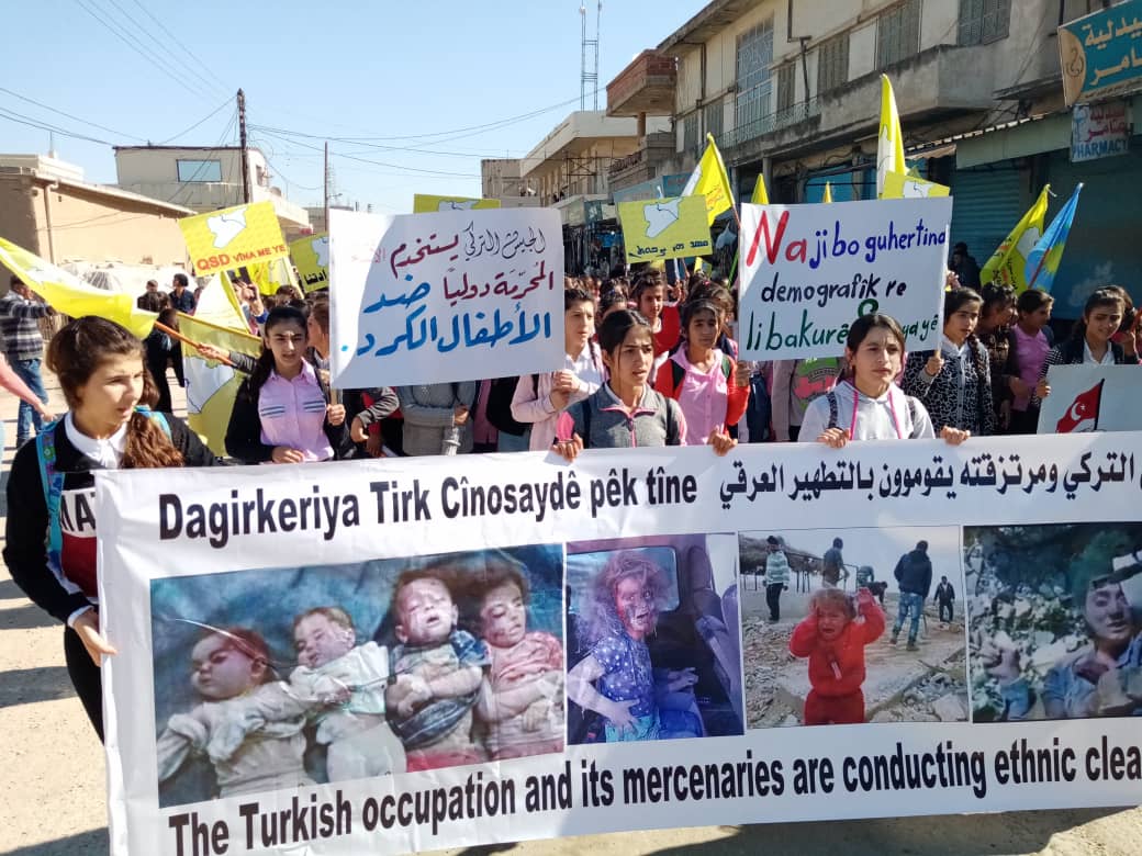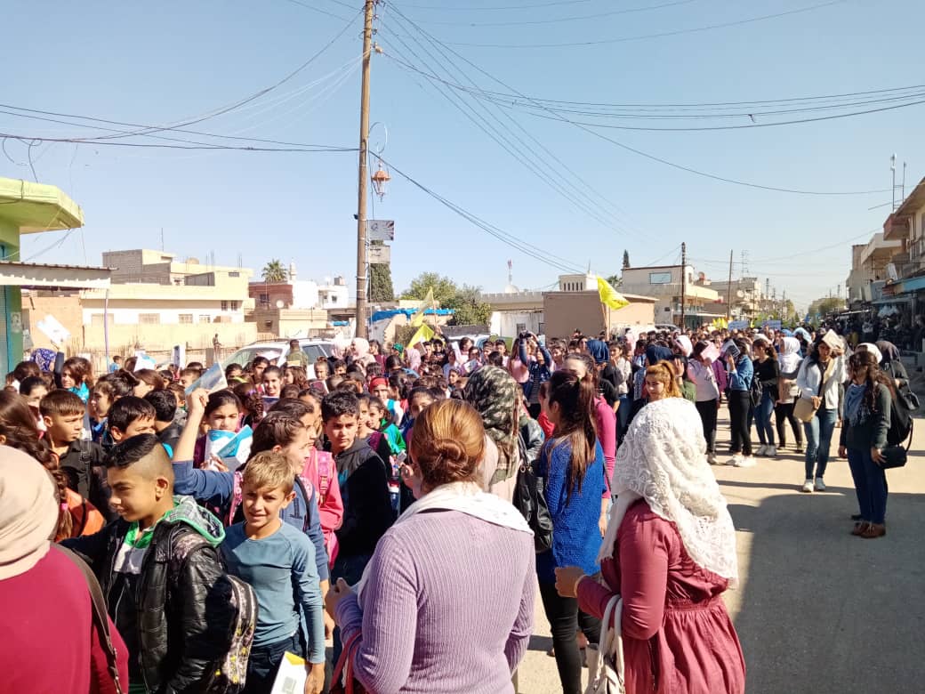 Xwendekar û mamosteyan pankartên bi nivîsên “Me qetil nekin, QSD’ê nûnertiya me dike, şerê ku dibistan û pêşeroja me wêran dike, rawestînin û li vir berxwedêr in”, wêneyên şehîdên Berxwedana Cenga Rojava û wêneyên zarokên qurbaniyên çekên kîmyawî, hilgirtin.