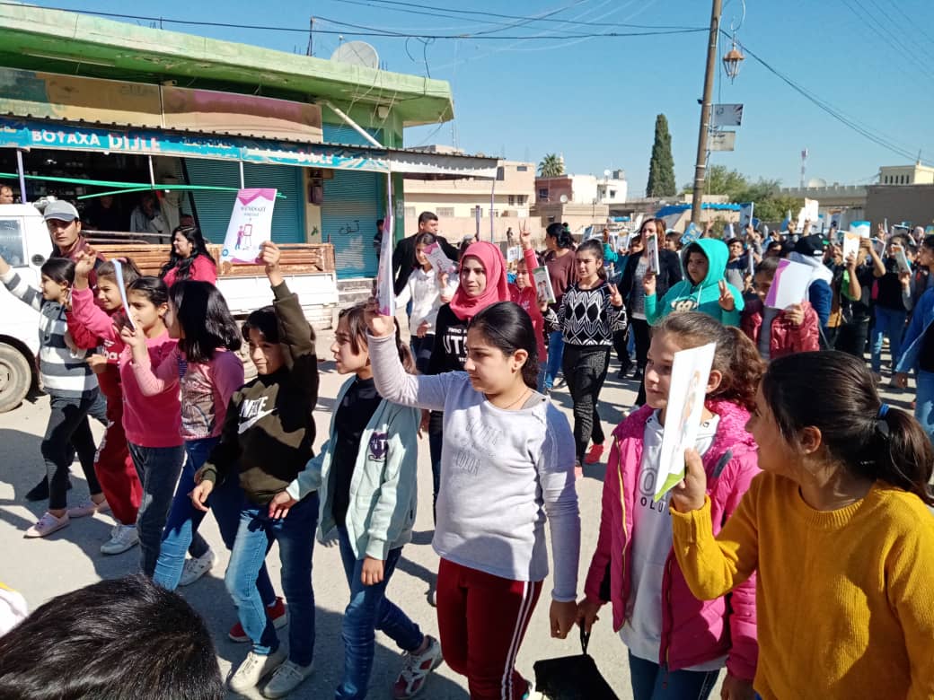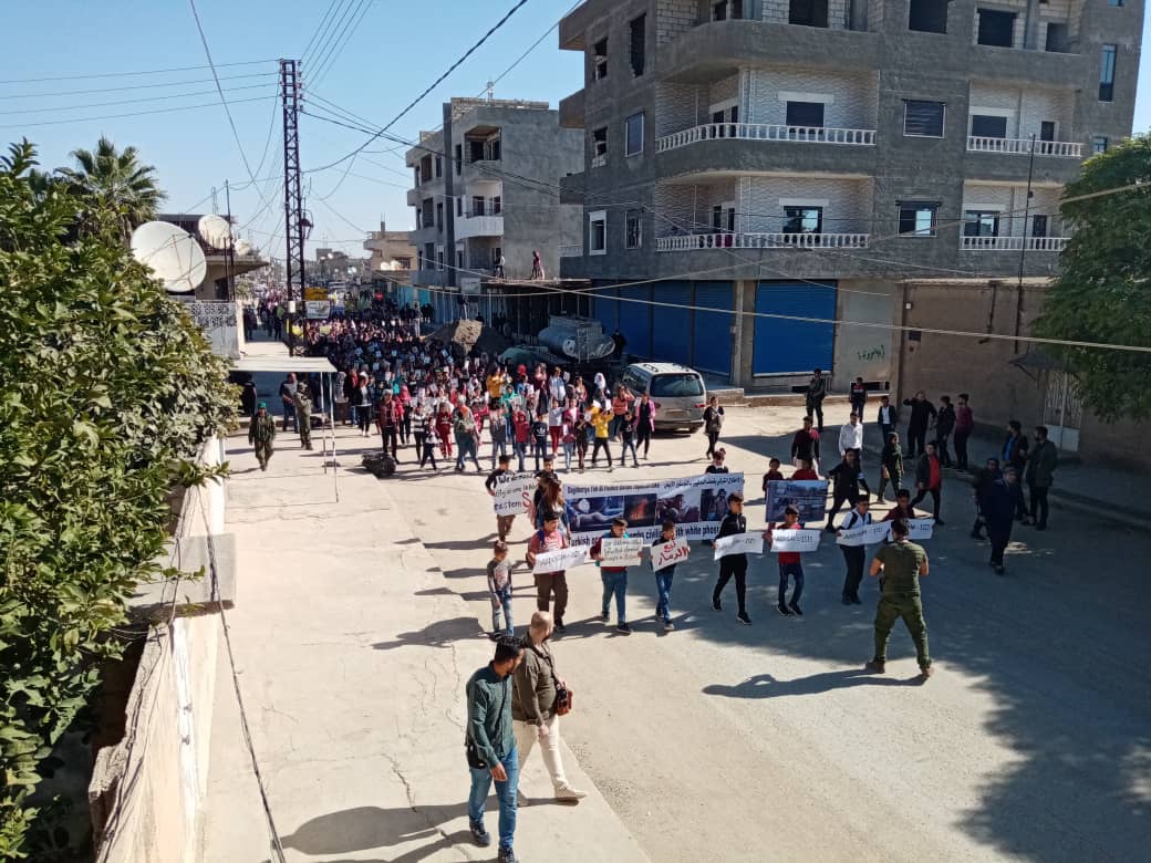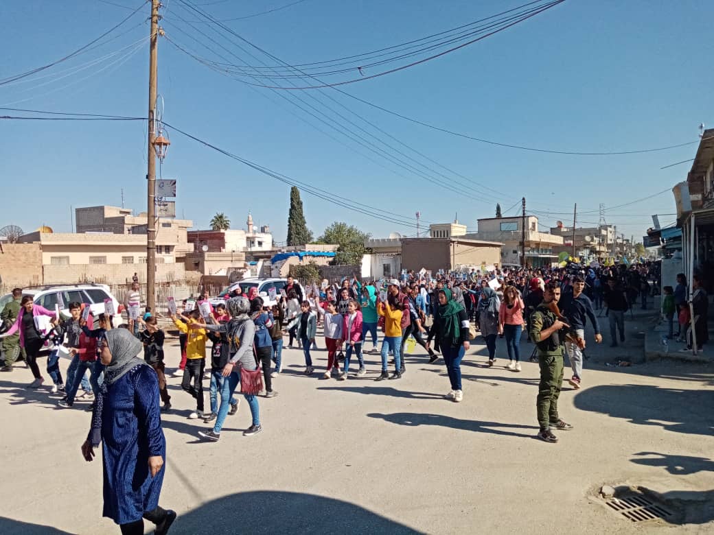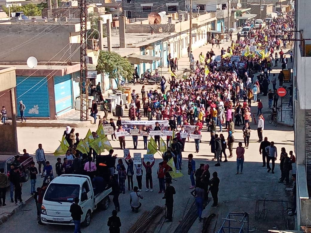 Xwendekar û mamosteyan pankartên bi nivîsên “Me qetil nekin, QSD’ê nûnertiya me dike, şerê ku dibistan û pêşeroja me wêran dike, rawestînin û li vir berxwedêr in”, wêneyên şehîdên Berxwedana Cenga Rojava û wêneyên zarokên qurbaniyên çekên kîmyawî, hilgirtin.