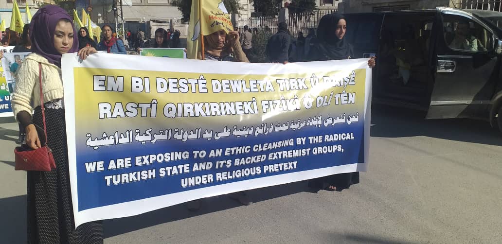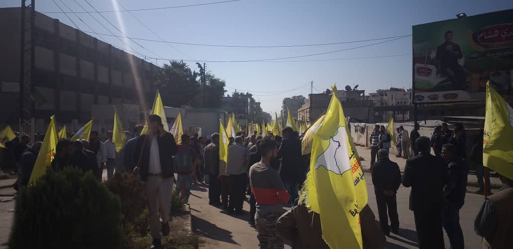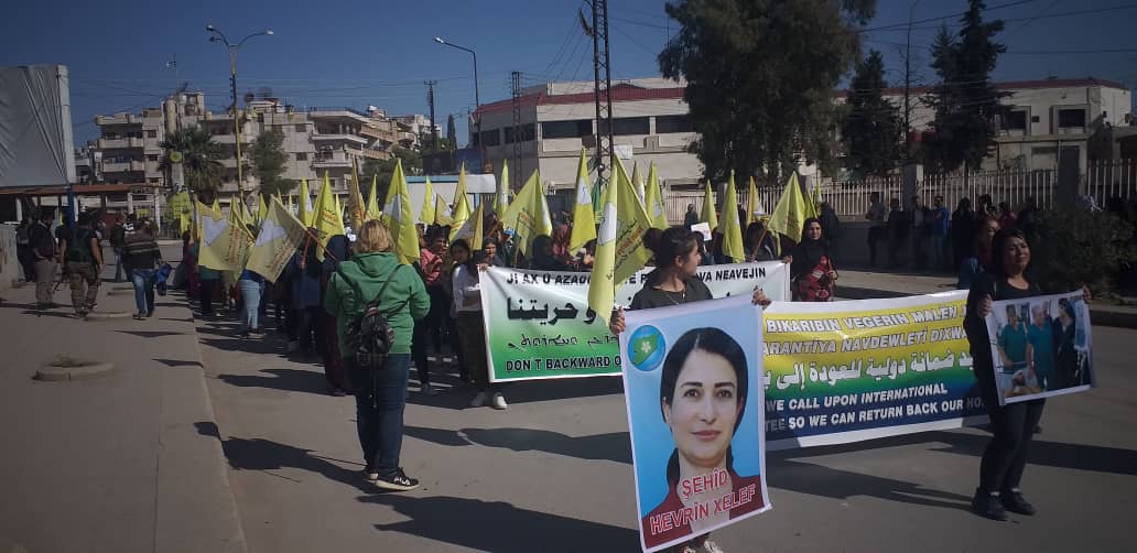 QAMIŞLO – Li bajarê Qamişlo bi sedan gel û çalakvanên kona berxwedanê di pêşengtiya koçberên ji Serêkaniyê bi dirûşemeya “Na ji dagirkeriyê re” daketin qadan û êrîşên artêşa Tirk a dagirker û çeteyên wê li ser Rojavayê Kurdistanê û herêmên Bakur Rojhilatê Sûriyê şermezar kirin. Meş li kolana şehîd Rûbar Qamişlo destpê kir û heta ber Navenda Komseriya NY’yê ya Kar û Barên Koçberan domiya.