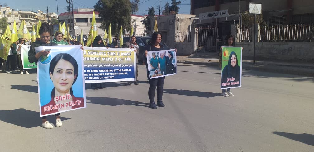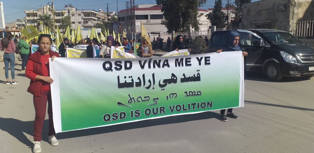 Çalakvanan wêneyên şehîdan, pankartên bi nivîsên erebî, kurdî, îngilîzî û suryanî, alên QSD’ê, YPG û YPJ’ê hilgirtin.