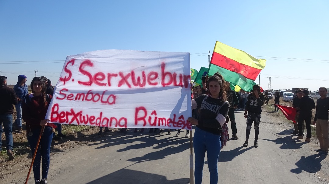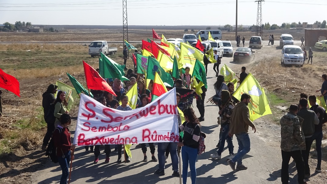 Çalakvan bi meşekê ber bi gund ve ketin rê û pankartên “Şehîd Serxwebûn sembola Berxwedana Cenga Rojava ye” hildan.