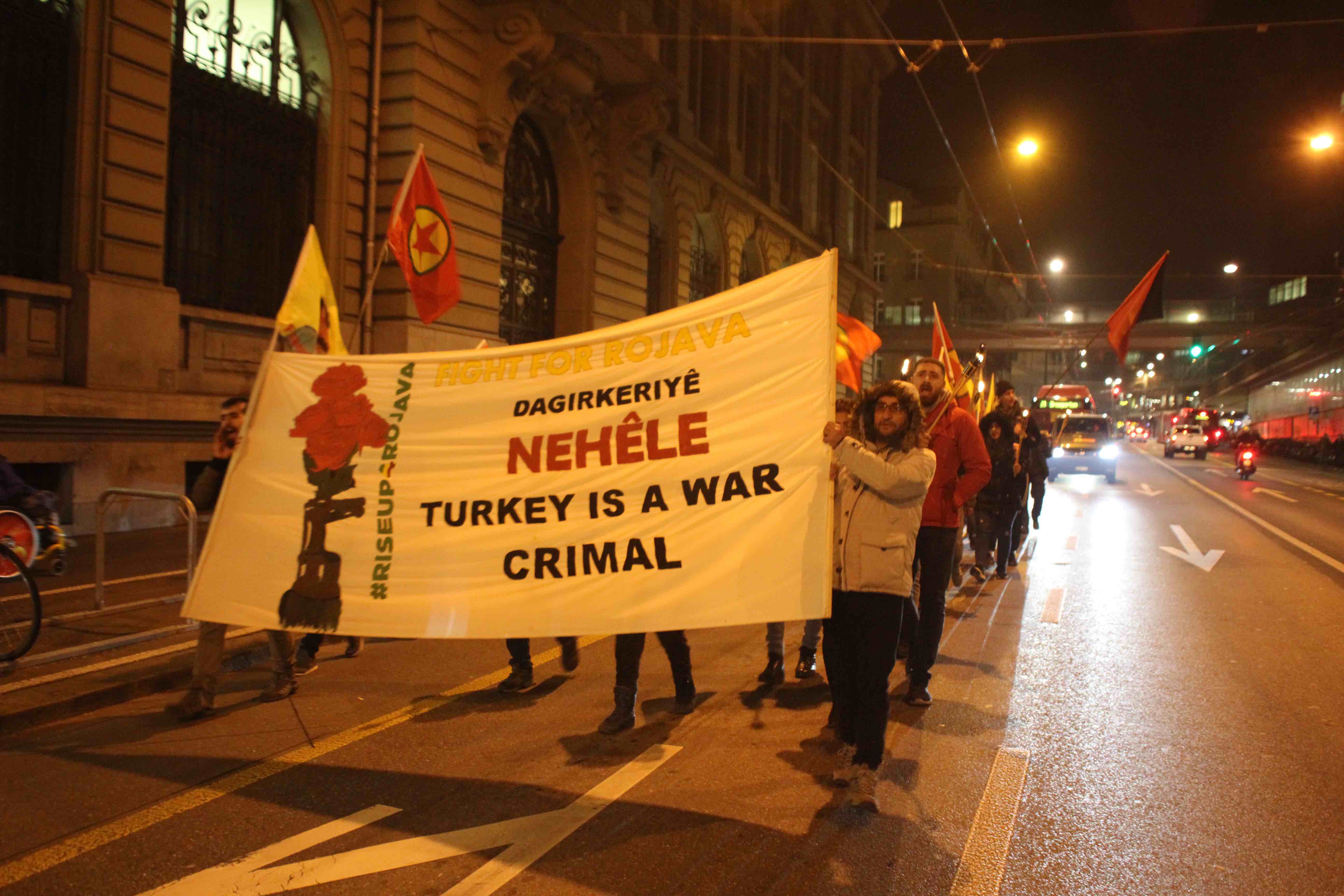 Li bajarê Bellînzona yê kantona Tîcîno jî Kurdistanî û dostên xwe bi pankarta “Rojava biparêze, rê nede dagirkeriyê” û alên PKK’ê meşiyan.