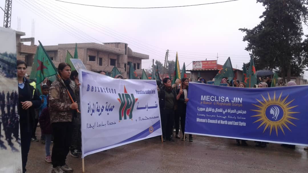 NAVENDA NÛÇEYAN – Di çarçoveya rêzeçalakiyên 25’ê Mijdarê Roja Têkoşîna li dijî Tundiya li ser Jinan bi dirûşma “Dagirkerî tundî ye, bi berxwedana Hevrînan em ê dagirkerî û faşîzmê têk bibin” û ji bo piştevaniya berxwedana YPJ’ê, li tevahî bajarên herêmên Cizîr û Firatê meşên girseyî li dar ketin.