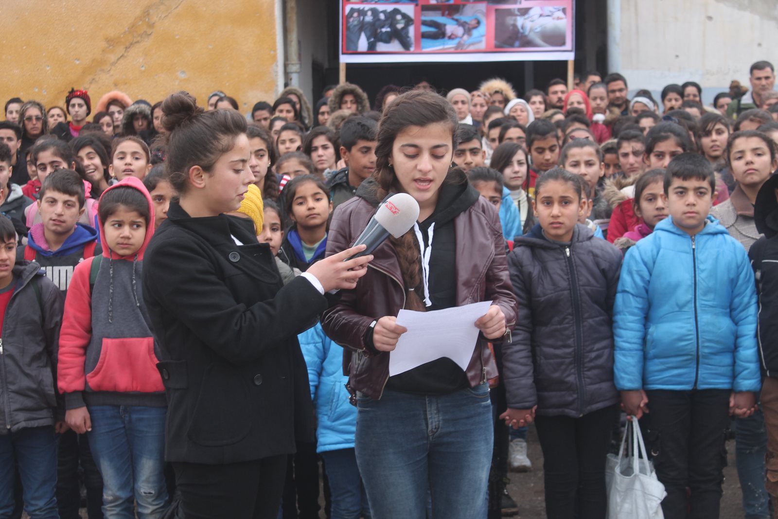 Em wek mamoste û xwendekarên Til Rifatê van komkujiyên nemirovî li ser zarokan şermezar dikin.