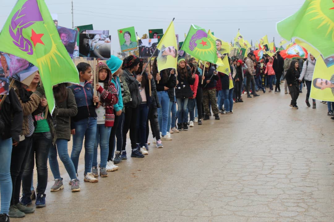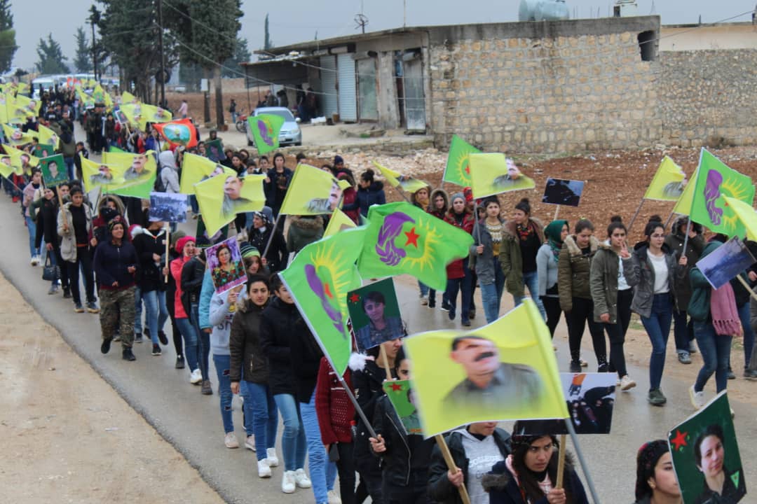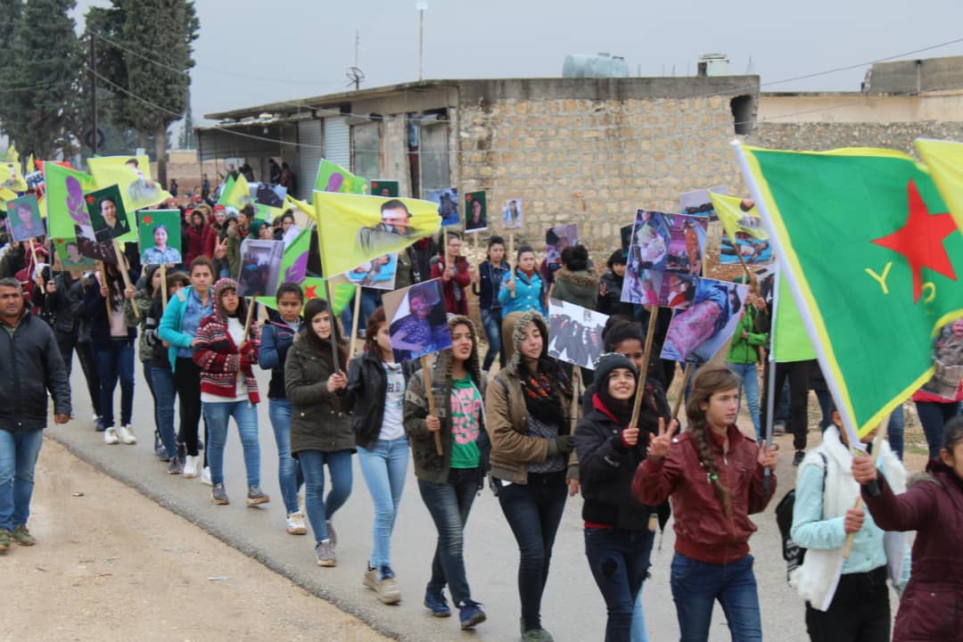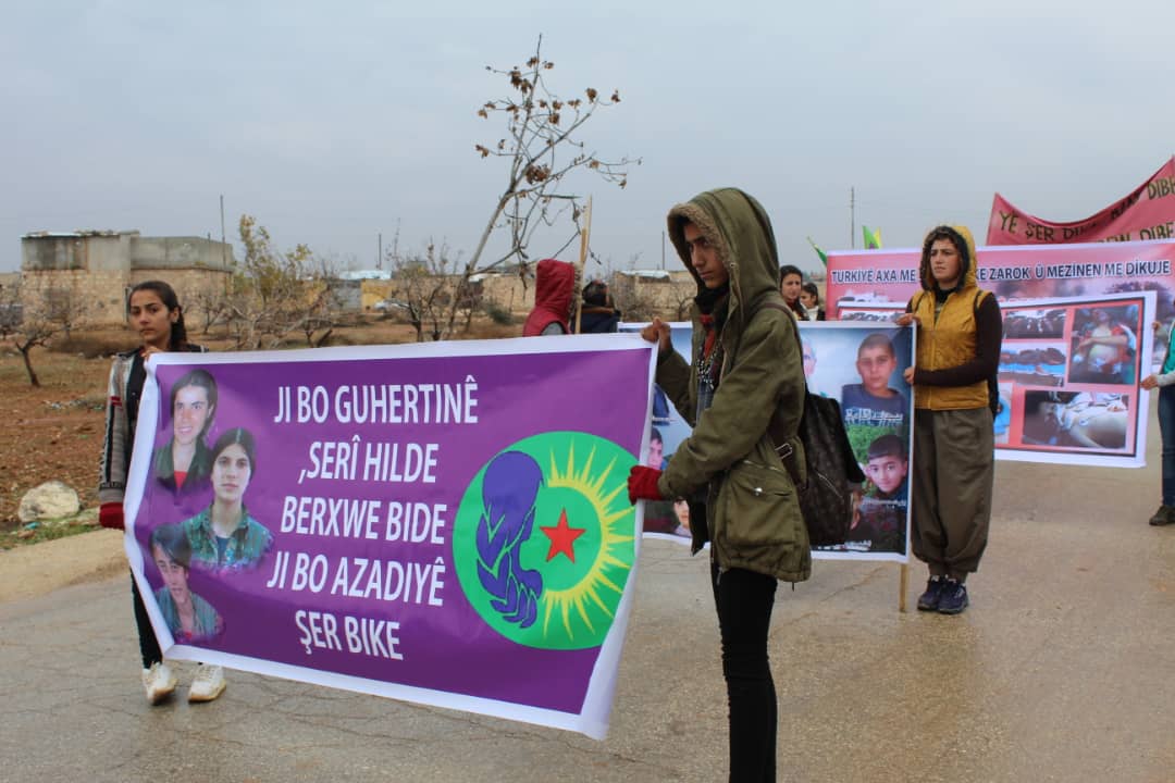 ŞEHBA – Yekitiya Jinên Ciwan a Herêma Efrînê da ku sûcên dewleta Tirk a dagirker şermezar bike, meşek bi xwepêşandana bi sedan ciwanan li dar xist.