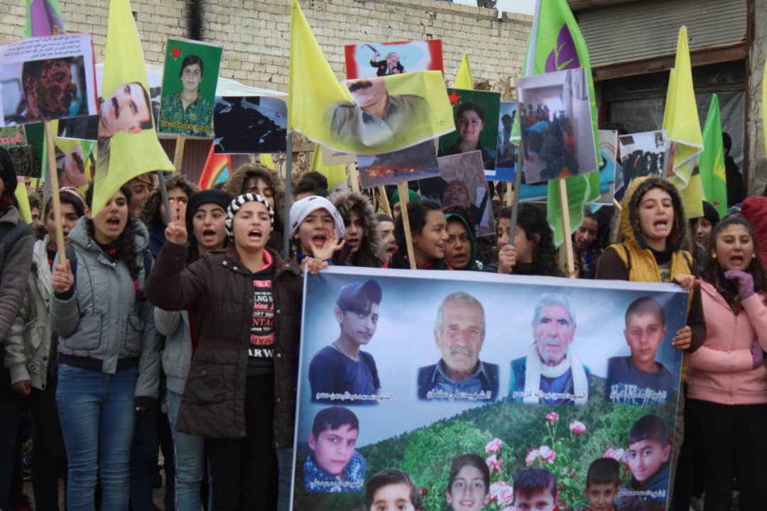 Îro bi dirûşma "Tirkiye xaka me dagir dike, zarok û mezinên me dikuje û Rûsya bê deng e" bi sedan ciwanên kantonên Efrîn û Şehbayê bi meşekê komkujiya ku dewleta Tirk a dagirker li navçeya Til Rifetê pêk aniye, şermezar kir.