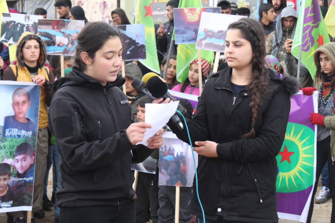Bi êrişên dewleta Tirk a dagirker re, zarok û mezin tên kuştin û komkujî li dijî sivîlan pêk tên. Her wiha jî komkujiya dawî ya ku dewleta Tirk a dagirker li bajarê Til Rifetê li dijî koçberên Efrînê yên ku ji berê hovîtiya dewleta Tirk û çeteyên girêdayî wê neçarî koçberiyê bûne, pêk aniye. Her wiha jî ev komkujî di nava bêdengiya navdewletî û rêxistinên hiqûqî de pêk tên ku bû sedema şehîdbûna 8 zarokan û 2’yên mezin.”