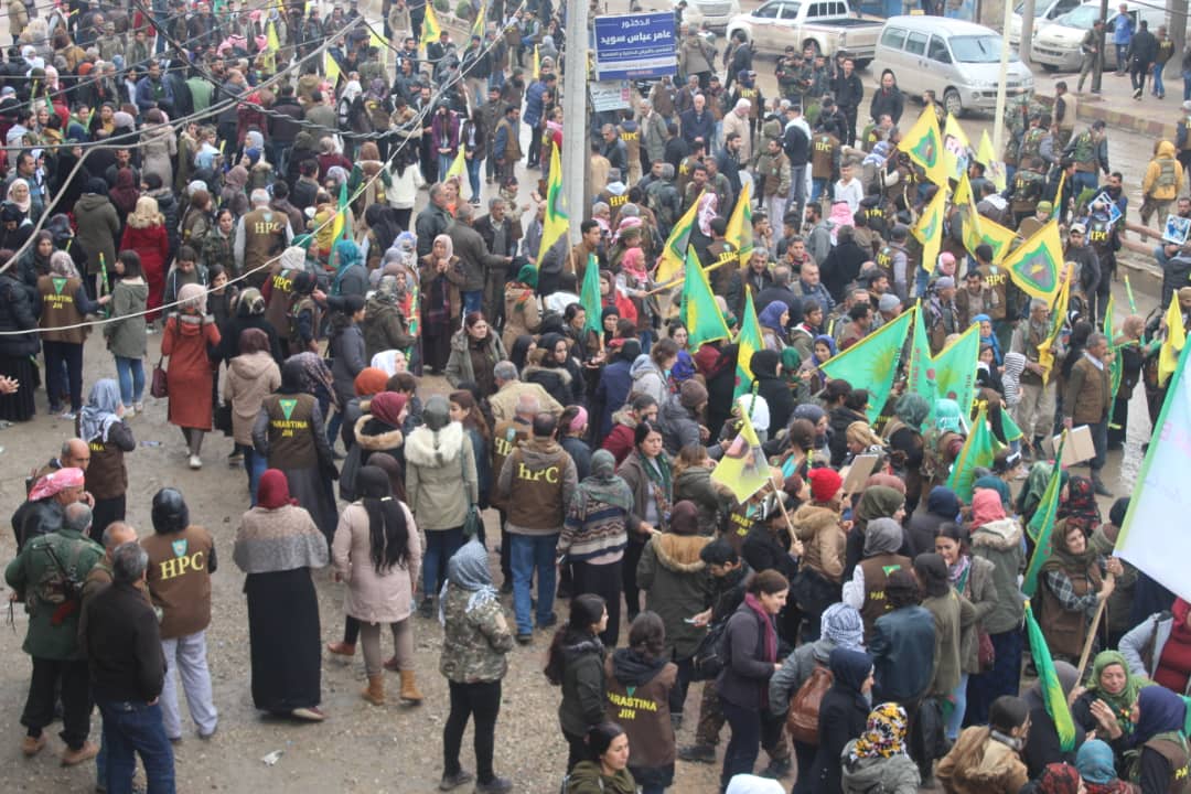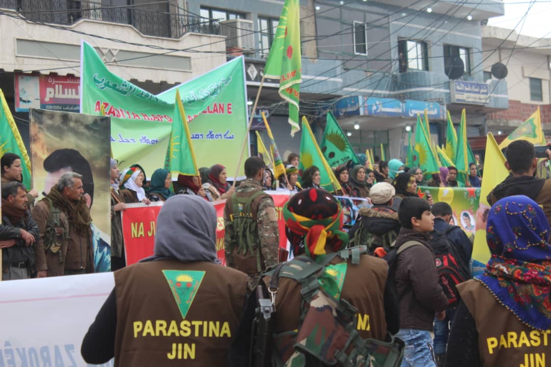 QAMIŞLO – Hêzên Parastina Civakî (HPC) yên kantona Qamişlo ya herêma Cizîrê li navçeya Girkê Legê meşek li dar xist. Bi hezaran endamên HPC`ê û şêniyên bajarok tev li meşê bûn. Di meşê de tecrîda li ser rêber Abdullah Ocalan, êrişên dewleta Tirk a dagirker û komkujiyên li herêmên Bakur û Rojhilatê Sûriyê hatin şermezarkirin.