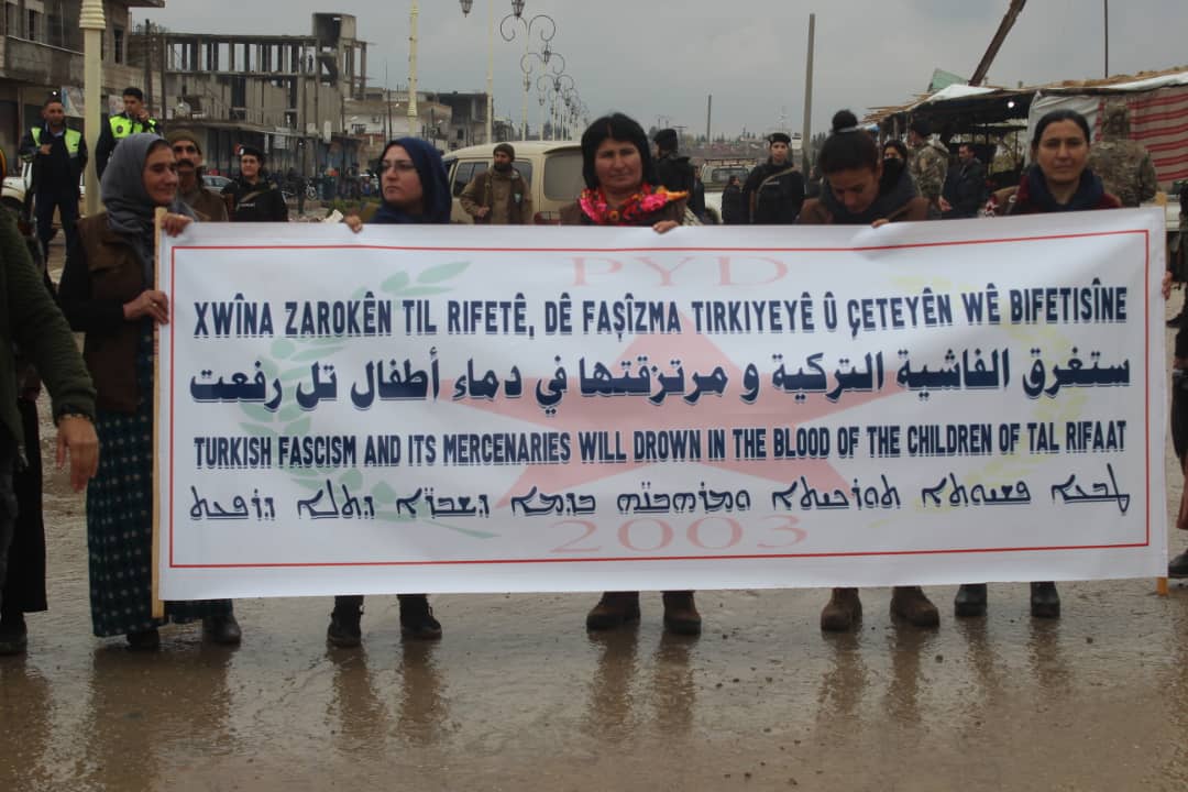 Di meşê de pankartên “Na ji dagirkeriya faşîst û destwerdana ji Bakur û Rojhilatê Sûriyê re”, “Azadiya rêber Ocalan azadiya tevahî gelan e”, “Faşîzma Tirkiyê û çeteyên wê dê di xwîna zarokên Til Rifetê de bifetise” û “Bi rihê fedayî dê neteweya demokratîk pêk were” hatin hildan.