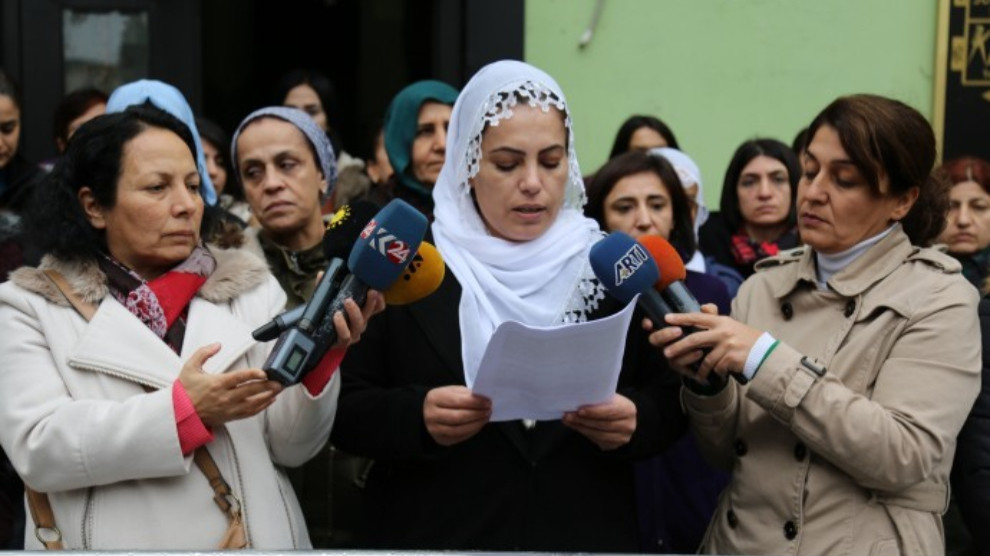 AMED – Meclîsa Jinan a Amedê ya Partiya Demokratîk a Gelan (HDP) bi munasebeta hefteya mafên mirovan li ber avahiya navçeya Yenîşehîrê civîna çapemeniyê çêkir. Palementera HDP’ê Remziye Tosun, Hevseroka HDP’ê ya navçeyê Hûlya Alokmen Ûyanik û gelek jin tevlî çalakiyê bûn. Deriyê avahiya navçeyê ku wê daxuyanî li ber vê bihatiba dayîn ji aliyê polîsan we hate dorpêçkirin. Şeklê Tirkî ya daxuyaniyê Tosun û Kurdiya wê jî ji aliyê Ûyanik we hate xwendin.