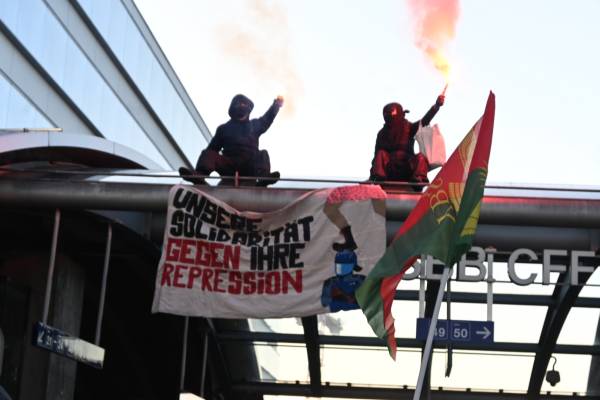 Rêxistinên koçberan ên Kurdistanî û Tirkiyeyî beşdarî çalakiyê bûn û çalakî li pêşiya îstasyona trenê destp^ekir. Çalakgeran dirûşmeyên “Bi pereyên we bi çekên wê gel tên qetilkirin”, “Berxwedana gelan berxwedan me ye”, “Bijî Berxwedana Şengalê” û “Jin, Jiyan, Azadî” berz kirin.