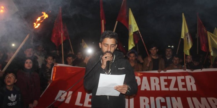 Meş li qada Şehîd Xemgîn rawestiya. Piştî deqeyek rêzgirtin endamê rêveber ê Tevgera Ciwanên Şoreşger Kemal Beşar bi navê xwepêşandêran daxuyanî xwend û got: “Komploya navneteweyî ya li dijî Rêber Abdullah Ocalan di sala 21‘an de berdewam e, komplo gelên Rojhilata Navîn bi giştî û gelê Kurd bi taybet dike hedef.”