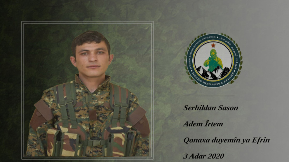 “Di 3’yê Adarê de şervanê me Serhildan Sason di qonaxa duyemîn a berxwedana Efrînê de li Efrînê şehît ket.