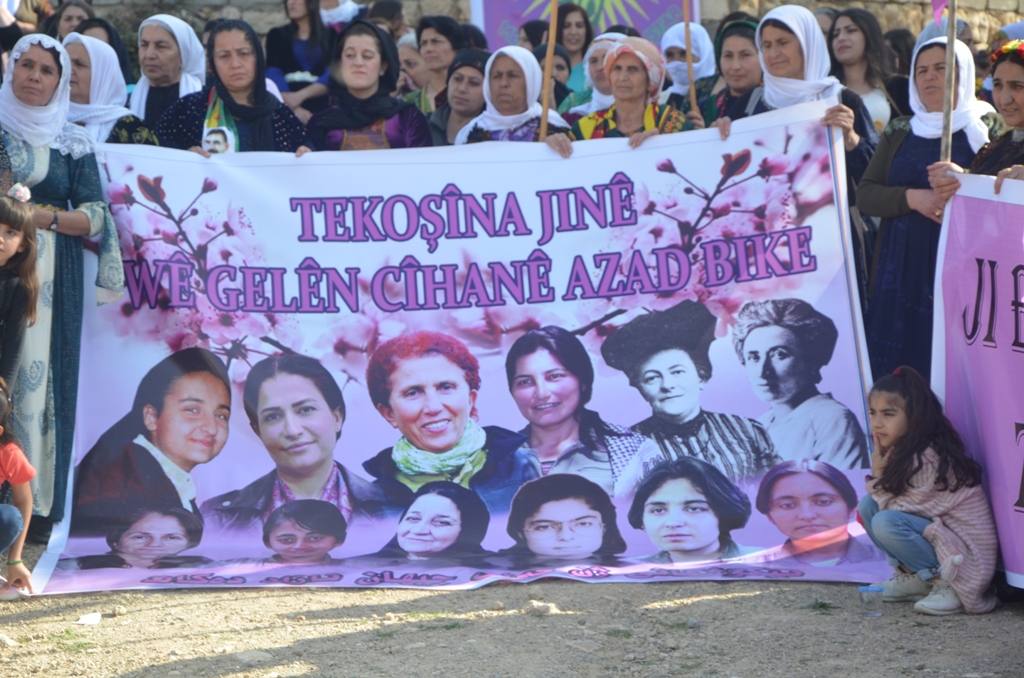 Li qada şahiyê al û posterên Rêberê Gelê Kurd Abdullah Ocalan, alên PKK, KCK, KJK, PAJK, YJA Star, TJA û pankartên bi nivîsên ‘8’ê Adarê li tevahî jinan pîroz be’, ‘Tekoşîna jinan wê gelên cîhanê azad bike’, ‘Ji bo guhertin û azadiyê tu jî rabe ser piyan’ û ‘8’ê Adarê pîroz be’ hate vekirin.