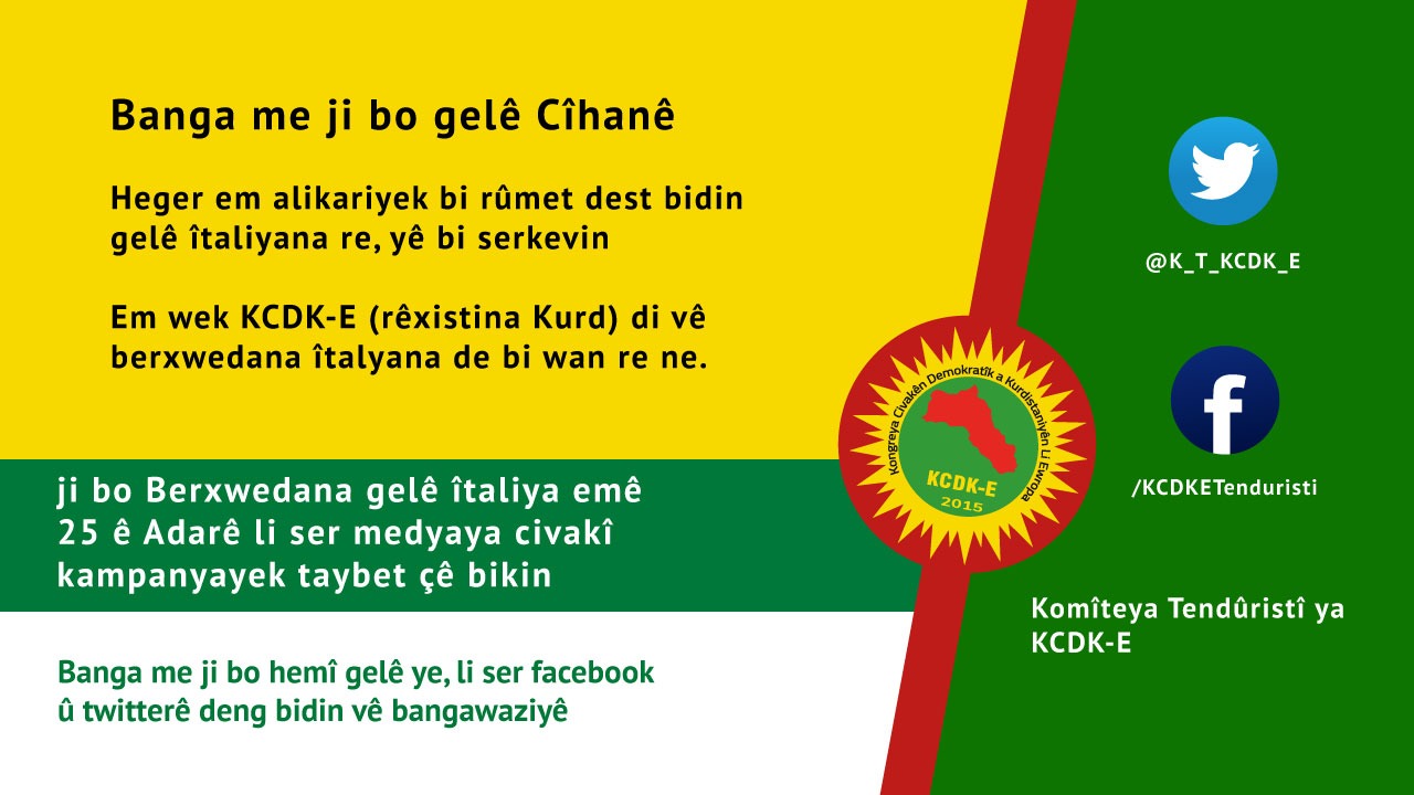Bi navê KCDK-E’yê em bang li navendên xwe yên civaka demokratîk, pêkhateyên xwe, gel û dostên xwe û mirovahiyê dikin ku 25’ê Adarê saet di 18:00 de beşdarî kampanya Hashtag a ji bo gelê Îtalyayê bibe.”