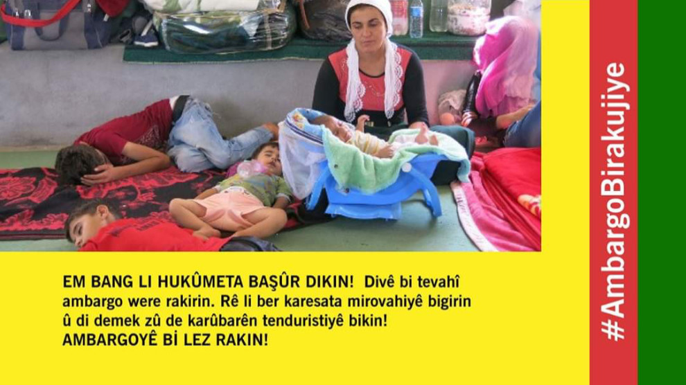 Di parvekirinan de ku wêneyên kampê hene, wiha tê nivîsandin, “Em bang li hikumeta Başûr dikin! Divê ambargo bi temamî bi dawî bibe. Pêşî li felaketa mirovî bigirin û tavilê dest bi xizmeta tenduristiyê bikin. Ambargoyê tavilê rakin.”