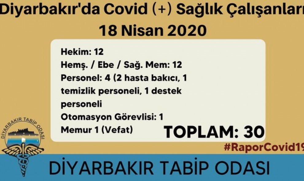 Odeyat Tabîban a Amedê (DTO) rapora Covit-19 ya têkidarî xizmetkarên tenduristiyê ya Amedê aşkere kir. Odeyê hurguliyên raporê li ser medya civakî parve kir û wiha got: “Heta 18’ê Nîsanê li Amedê 12 bijîşk, 12 hemşîre, ebe û karmendên tenduristiyê, 4 personel, 1 Peyvirdarê Otomosyonê, 1 karmend, (jiyana xwe ji dest da) bi şewba vîrûsa corona (Covît-19) ketin. Bi giştî 30 kes bi vîrûsê ketin û karmendekî jiyana xwe ji dest daye.