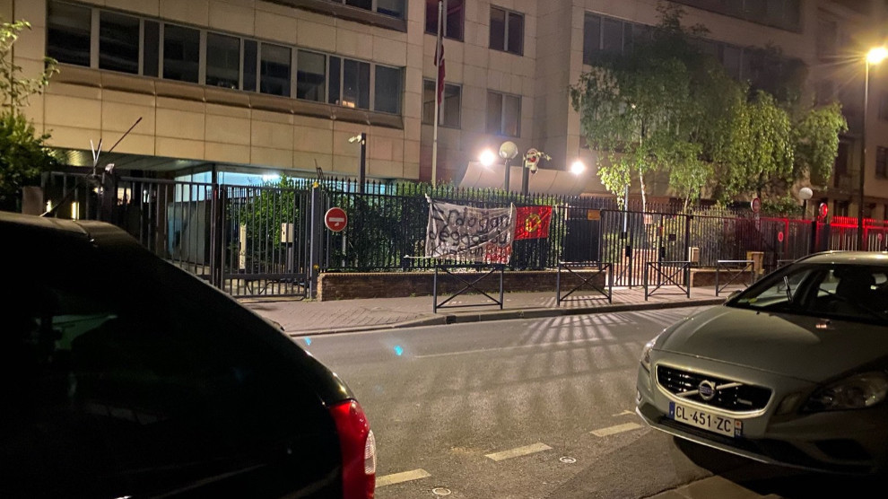 Ji bo şermezarkirina êrişên dagirkeriyê yên dewleta Tirk ên li Başûrê Kurdistanê, ala PKK'ê bi Konsolosxaneya Tirk a li paytexta Fransa Parîsê hate daliqandin.