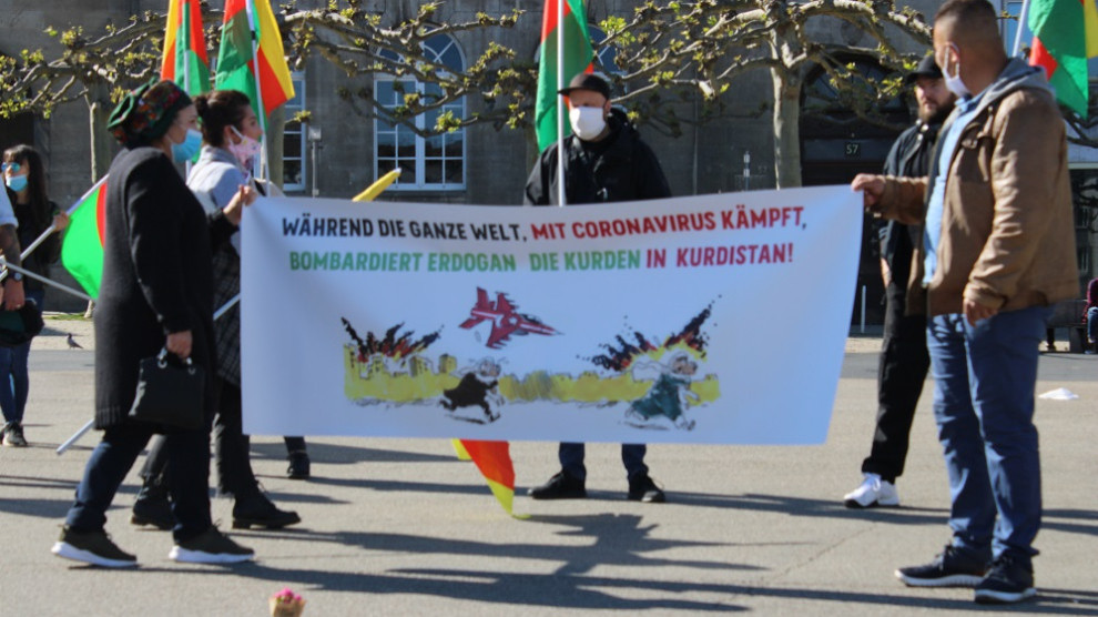 Çalakî li Konîgplatzê pêk hat û alên TEV-DEM’ê û pankarta Elmanî ya bi nivîsa “Di demekê de ku cîhan hemû li dijî vîrûsa koronayê têdikoşe, Erdogan bi balafirên xwe yên şer bombeyan li Kurdan dibarîne” hildan.