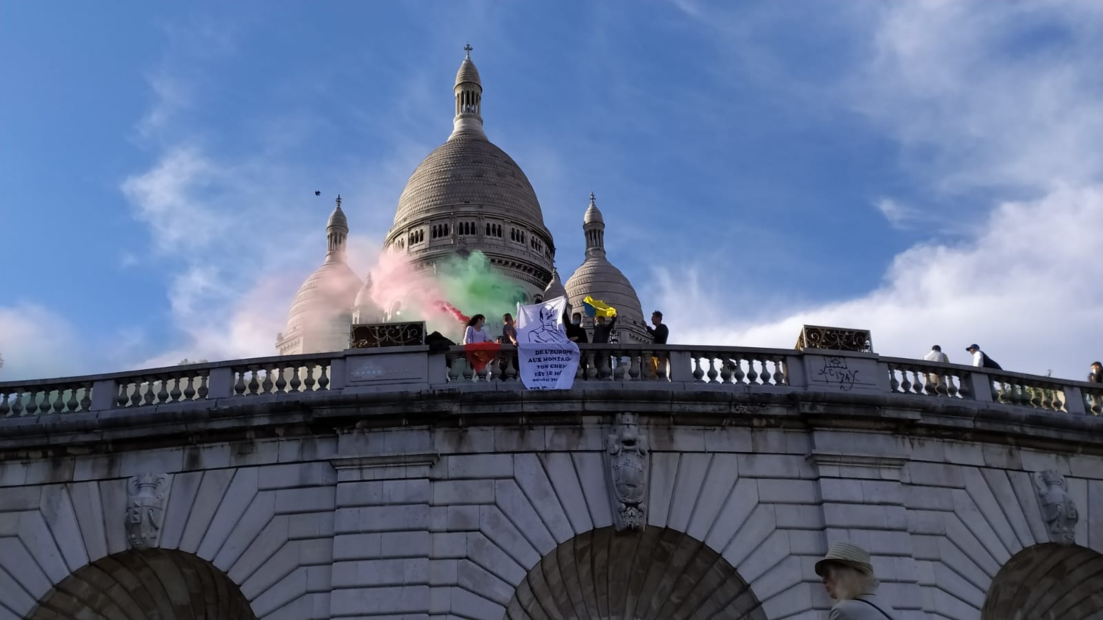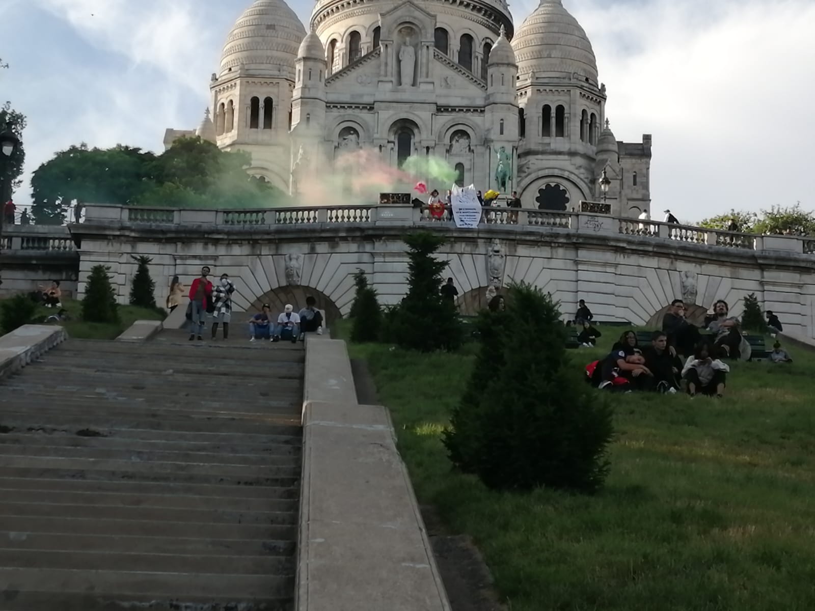 Aktivîst li ber bîrdariya Bazîlîkaya Sacré-Cœur hatin cem hev, daxuyanî dan, piştî daxuyaniyê pankarta, ”Ji Ewropayê heta bi çiyê rêya te rêya me ” ya ku ji bo Qasim Engîn ê şehîd hazir kiribûn vekirin û bi bîrdariyê ve daleqandin.