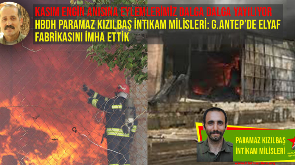 Di daxuyaniyê de hate gotin ku, “Di 18’ê Hezîrana 2020’an de di destê sibehê de li Herêma Senayiyê ya Organîza ya Dîlokê ya 3’emîn fabrîkeyeke elyafê ya li ser 7 hezar metrekareyan ji aliyê Milîsên me yên Tolhildanê ya Paramaz Kizilbaş HBDH’ê ji bo bibîranîna Kasim Engîn çalakiyek hatiye lidarxistin. Di vê çalakiyê de fabrîke şewitiye, bi dehan wesayîtên agirkujiyê, bi bi sedan polîs û xebatkarên îtfaiyeyê nekarîne şewatê bitefînin.”