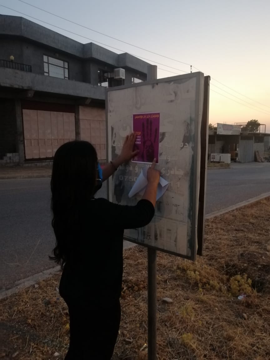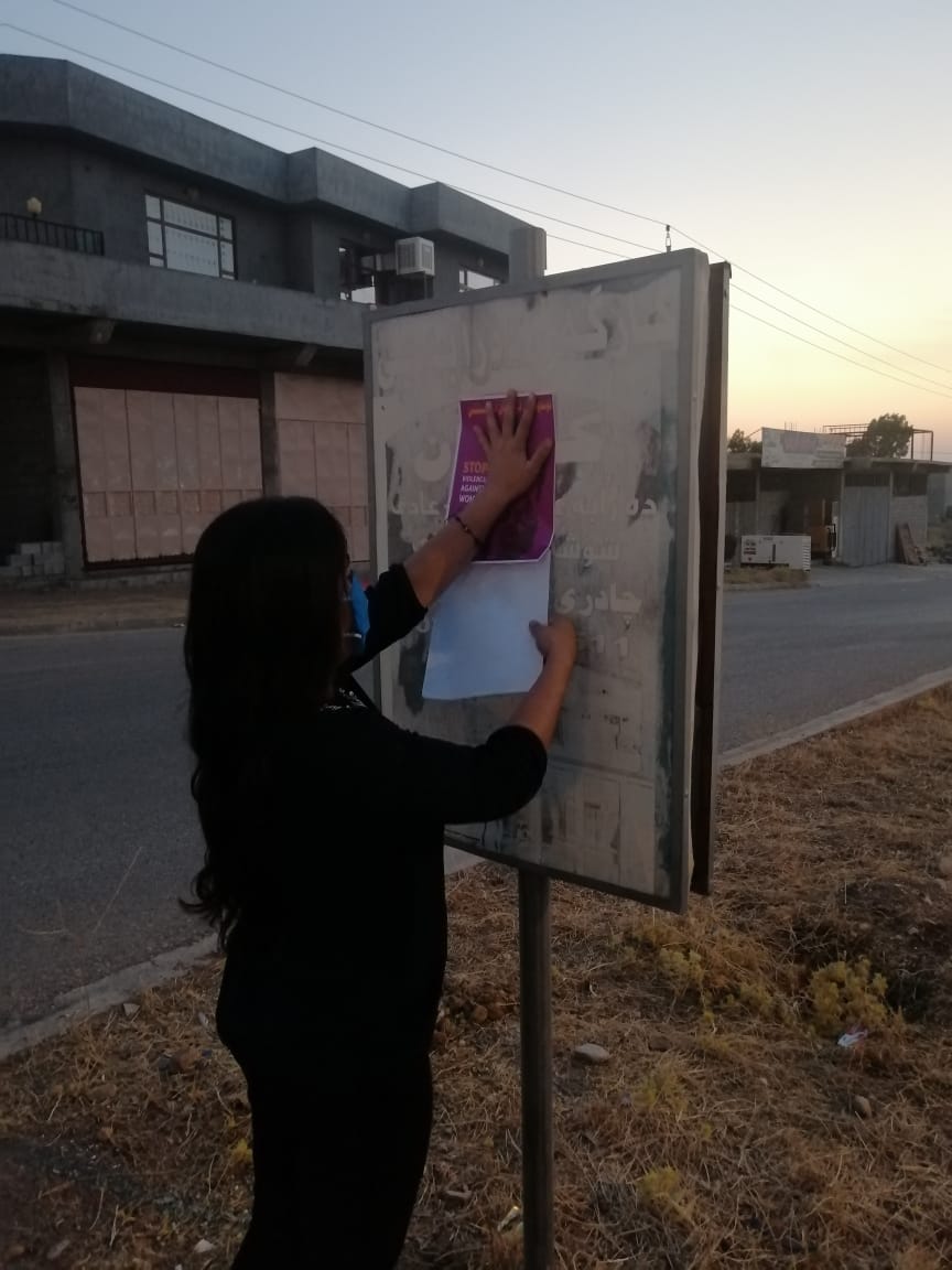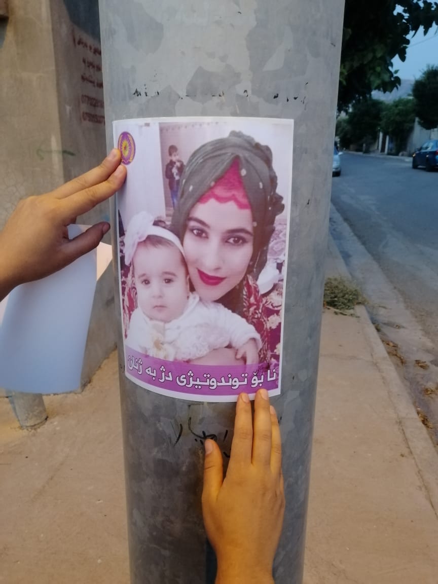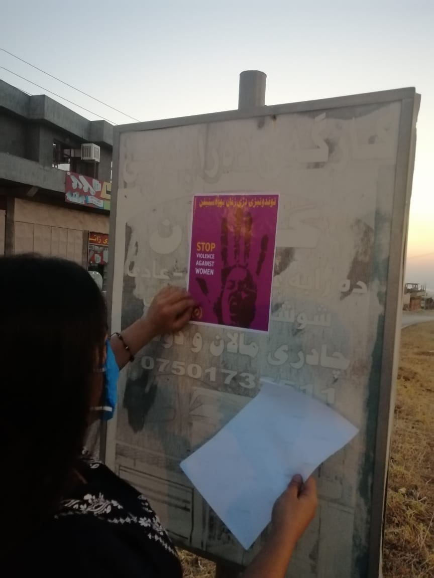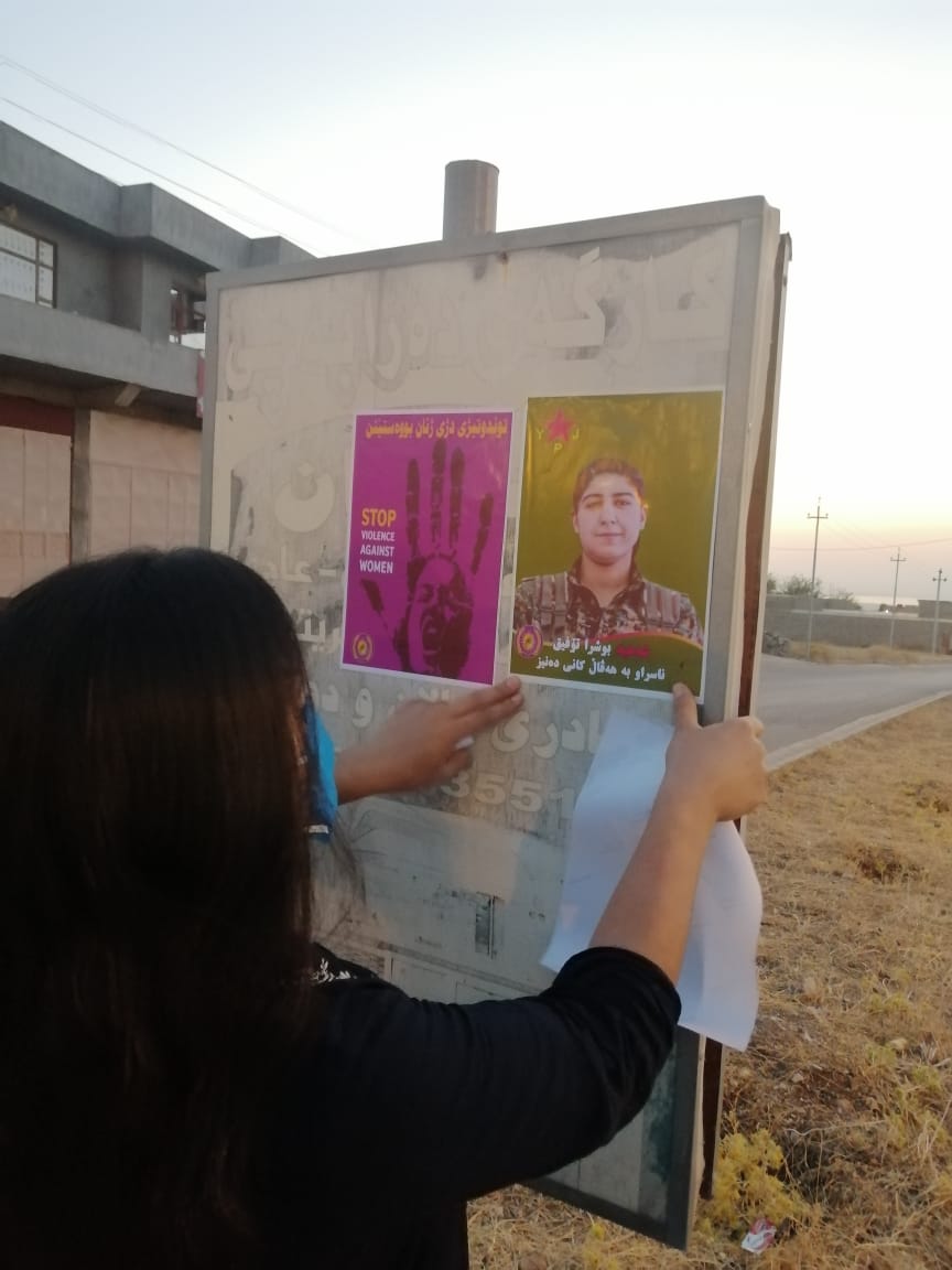 SİLÊMANÎ – Jinên Ciwan yên Têkoşer li Navçeya Seyd Sadiq ya Bajarê Silêmanî li dijî şideta ser jinê li her deverê navçê pankart daleqandin.
