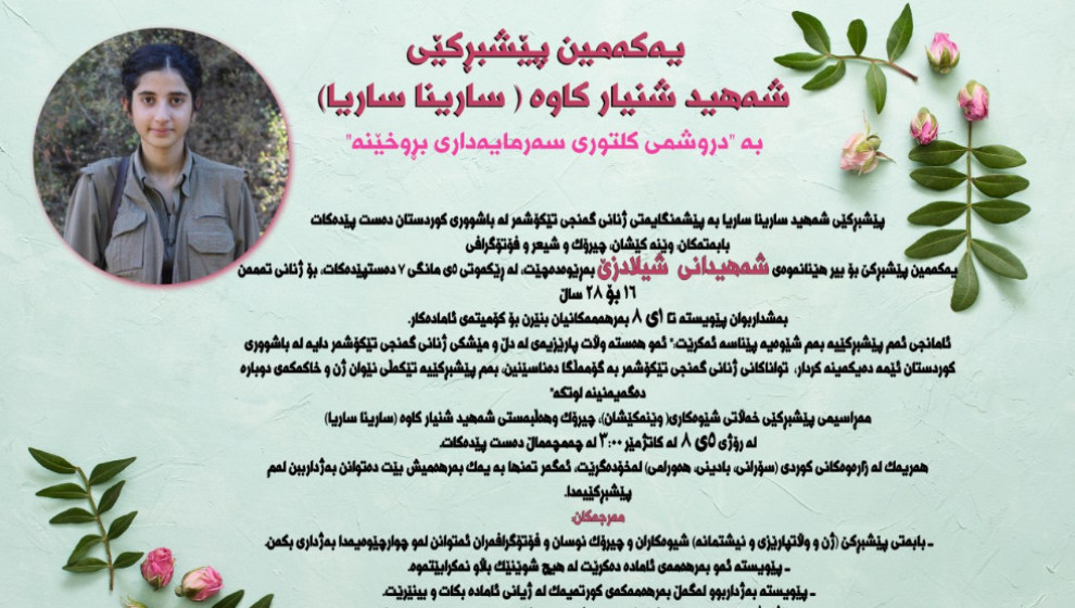 Yekemîn Pêşbirka Şêwekarî, Wênekêşî, Çîrok û Helbestan a Şehîd Şînyar Kawa (Sarîna Sarya) bi pêşengtiya Jinên Ciwan ên Têkoşer li Başûrê Kurdistanê destpê dike.