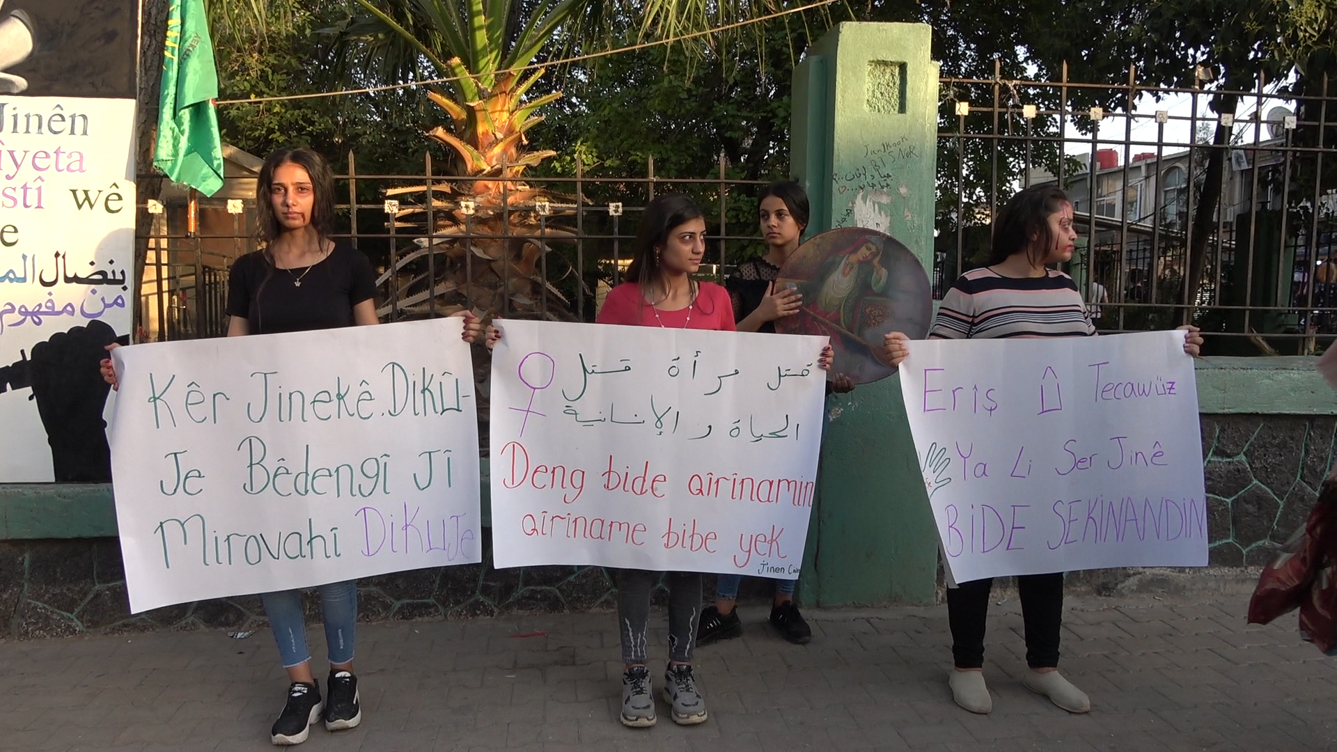 Yekîtîya Jinên Ciwan ji ber tundîyê ku zînîyeta dewlet û zilam, li ser jin dimeşînin protesto bikin, li Rojavayê Kurdistanê li bajarê Qamişlo kom bûn.