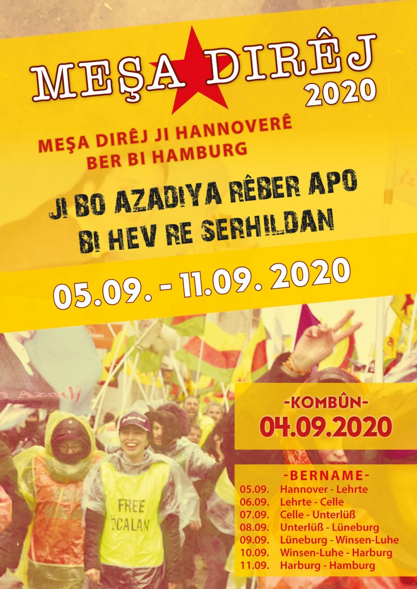 NAVENDA NÛÇEYAN – Meşa Dirêj ku her sal ji bo azadiya Rêberê Gelan Abdullah Ocalan bi rengekî kevneşop tê lidarxistin, îsal di navbera 5-11’ê Îlonê de li bajarê Hannoverê yê Elmanyayê dest pê dike. Meş wê bi dirûşma “Ji bo azadiya Rêber Apo, bi hev re serhildan” heta bajarê Hambûrgê bidome.