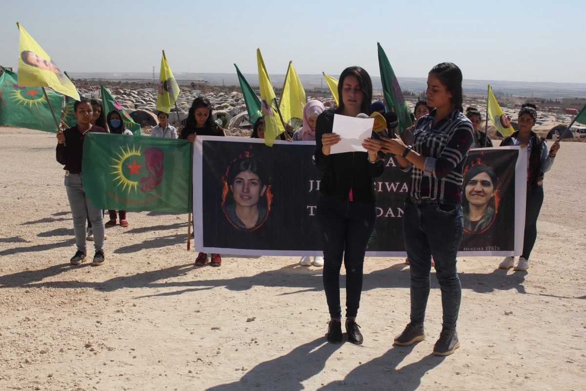 ŞEHBA – Bi dehan endamên Yekîtiya Jinên Ciwan li kampa Serdemê ya kantona Şehbayê kom bûn, alên Yekitiya Jinên Ciwan, wêneyên Rêberê Gelan Abdullah Ocalan û pankartên bi nivîsên”Serhildana Jinên ciwan tolhildan e” hildan.