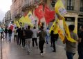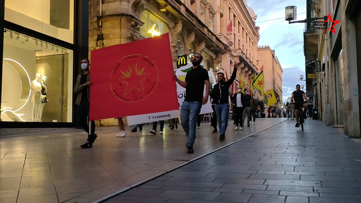 Di meşê de ku li kolana Saînte Catherîneyê dewam kir bi zimanên Fransî û Kurdî pankartên bi nivîsa “Bi hev re serhildan”, “Rojava biparêze” hatin hildan û aleke mezin a TCŞ’ê hate vekirin.