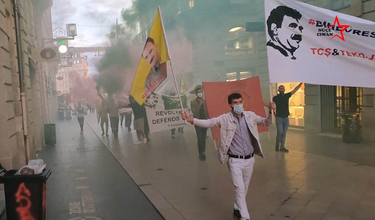 Ciwanan dûyê reng bi reng hi dan û dirûşmên bi zimanên Kurdî û Fransî ji bo azadiya Ocalan qîriyan.